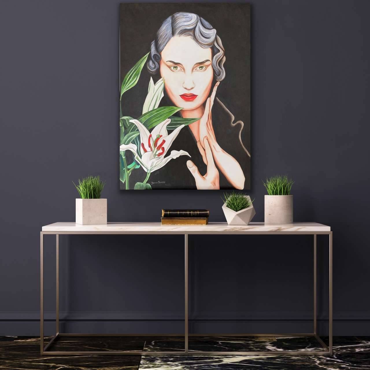 The image depicts an incredibly intriguing woman with a lily. Saturated colors illuminate the scene, especially shades of green and white that dominate through the leaves and the flower. The red of her lips contrasts with her pale complexion, adding drama to the whole. Her eyes, green like a forest, draw the gaze. The composition is carefully considered—symmetrical, but with a twist. Lilies intertwined with the woman’s hand create a harmonious composition. The atmosphere? It’s extraordinarily mysterious, even magnetic. The artist used realistic techniques, blending detail with a touch of surrealism. Gosh, it’s so beautiful. The viewer may feel a mix of awe and unease, wondering about the hidden meaning. How to put it in English: it’s mesmerizing. Perhaps it’s a painting about the transience of beauty, idealism, or a woman’s inner strength. In my reflection, I think about how art can capture such an elusive moment—almost like holding one’s breath. Such incredible attention to detail and emotion. I look at this painting and a quote comes to mind: “Beauty is in the eye of the beholder.” And that, in my opinion, is the essence of the piece.