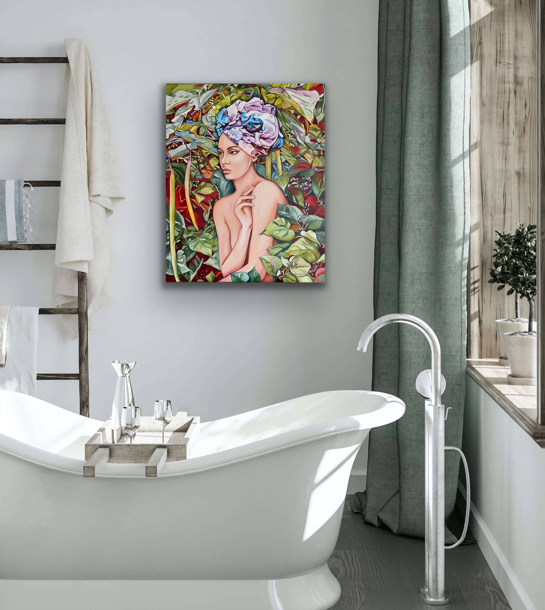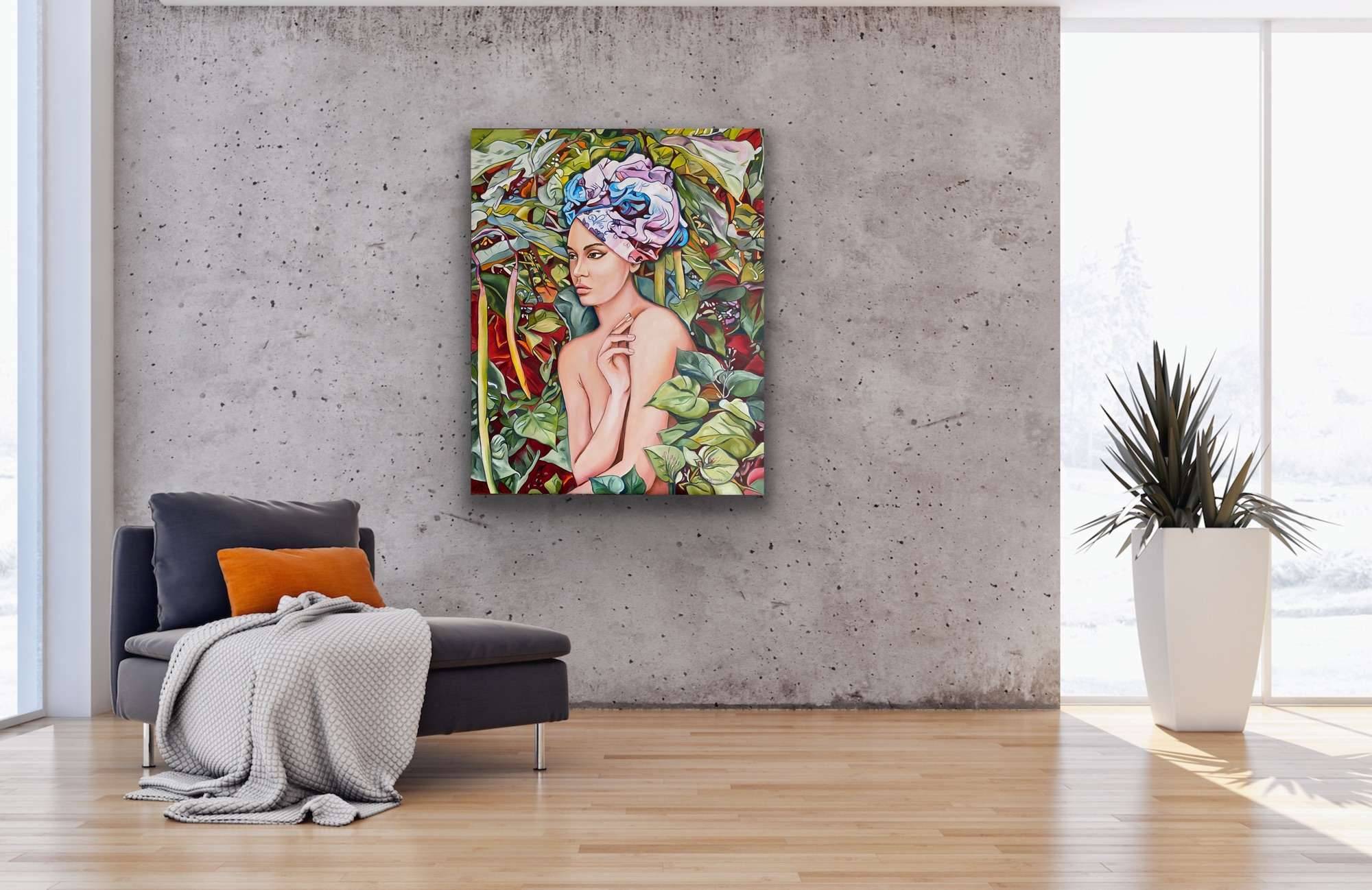 The painting mesmerizes with its colorful mosaic. Greens, reds, and purples dominate, wonderfully blending into a vibrant composition. Looking at the woman’s portrait, our attention is drawn to her gaze, deep and contemplative. It is the eyes that are the focal point of this work. The flowers and leaves surrounding the figure call to mind a lush jungle, where nature meets the human soul. The atmosphere of the painting is both calm and dynamic—full of hidden stories. The artistic style combines realistic elements with abstract forms. The shapes seem to move, and the colors come to life before our eyes. The artist achieved this effect through a delicate play of light and shadow, varying the textures. This makes the painting radiate emotion, encouraging reflection on what lies beneath the surface. It is like discovering a secret garden in the midst of one’s own thoughts. Little Johnny might say, “Cool, but why does that lady have flowers on her head?” Looking at the work, I feel peace and harmony. There is something magical in the way the artist showed the unity of humanity and nature. You wonder what the female artist had in mind. Is this a painting about beauty in diversity? Or perhaps about finding oneself in the chaos of the world? This “masterpiece” offers many possibilities for interpretation; the viewer may feel a range of emotions—surprise, contemplation, and even joy.