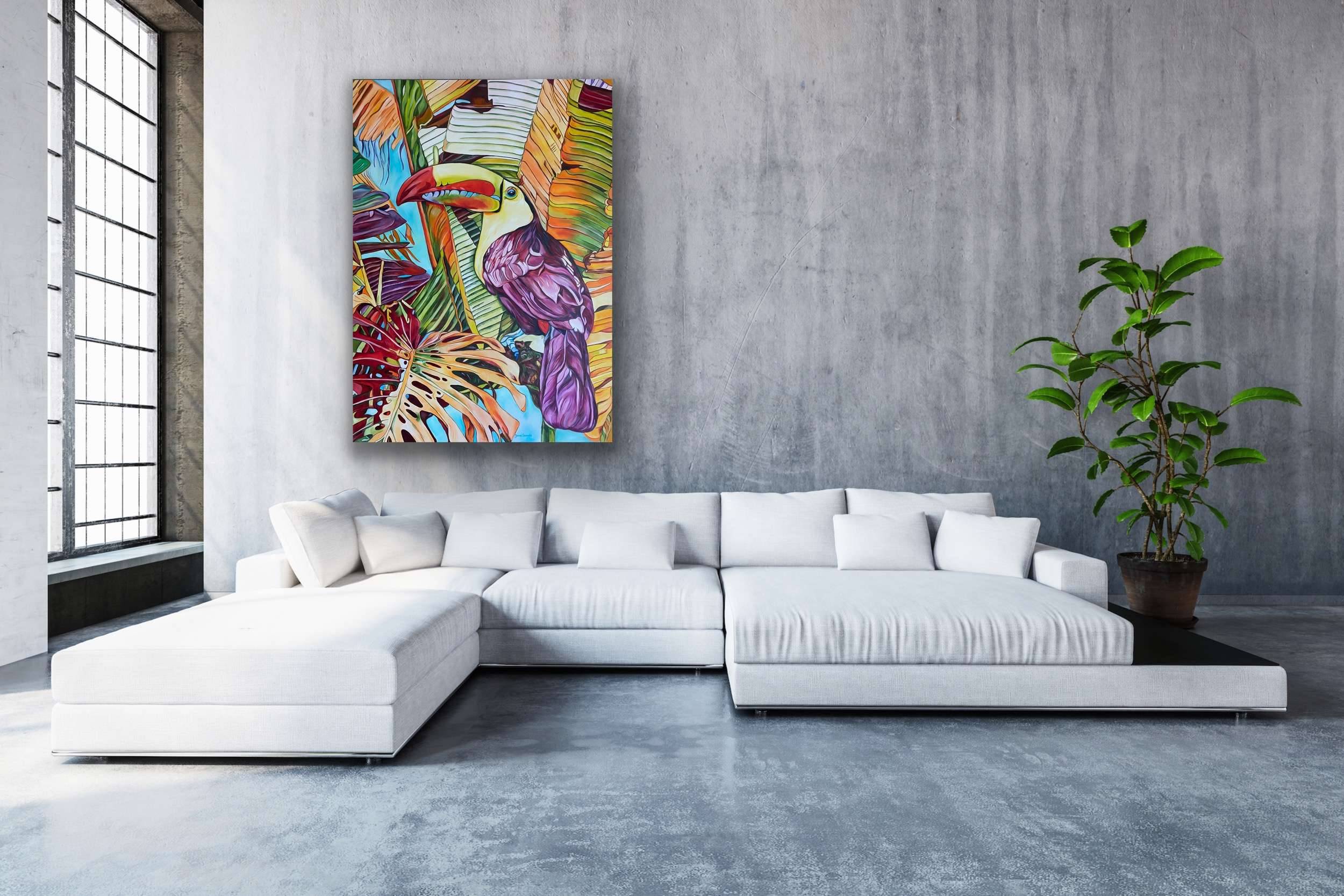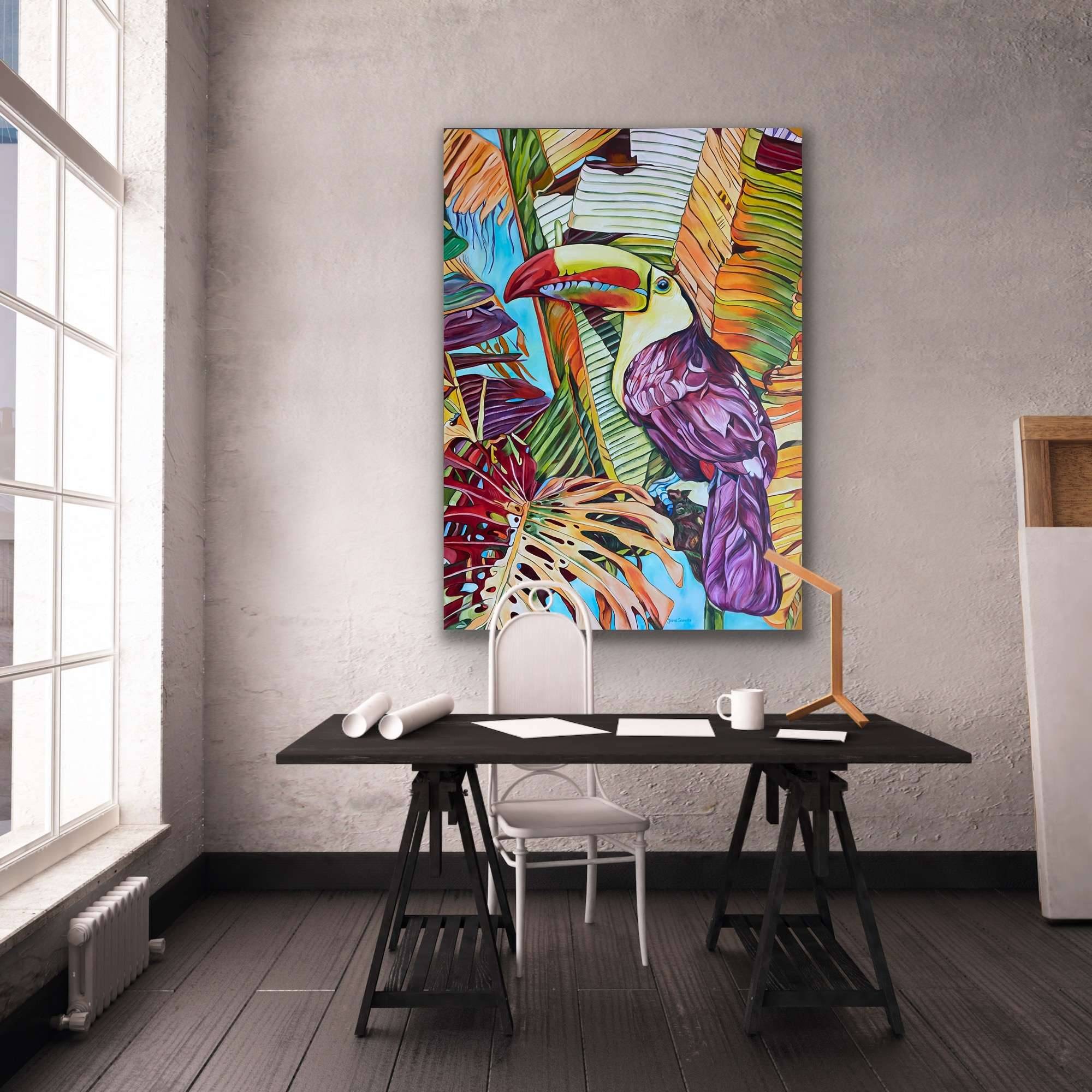 In the painting we see a colorful little toucan lazily peering out from behind the jungle leaves. It’s surrounded by greenery that blends with intense shades of orange and yellow. The leaves look as if they were cut from cardboard and arranged in an artful chaos. The composition draws the eye, and the viewer’s gaze wanders through the recesses of this tropical scene. A holiday atmosphere! It’s warm; you can feel the humidity and the exotic vibe. You can almost hear the painting: birds chirping, leaves rustling. There’s something of magical realism in it—like a vacation forever framed. The style is vivid and dynamic, full of life and energy. The technique the artist uses recalls hand-painted watercolors, or perhaps oils. The colors are saturated, almost ready to leap out of the canvas and drench you with their freshness. The viewer may feel like an explorer, someone who has just found themselves in the heart of the Amazon jungle. I feel joy looking at this piece. I think to myself, “I wish I were there, to listen to the rustle of the leaves.” What an amazing feeling! This painting brings a smile and a longing for adventure. A child would say, “The toucan has a big nose and is sitting on a big leaf!” Such little beauty, captured in art.