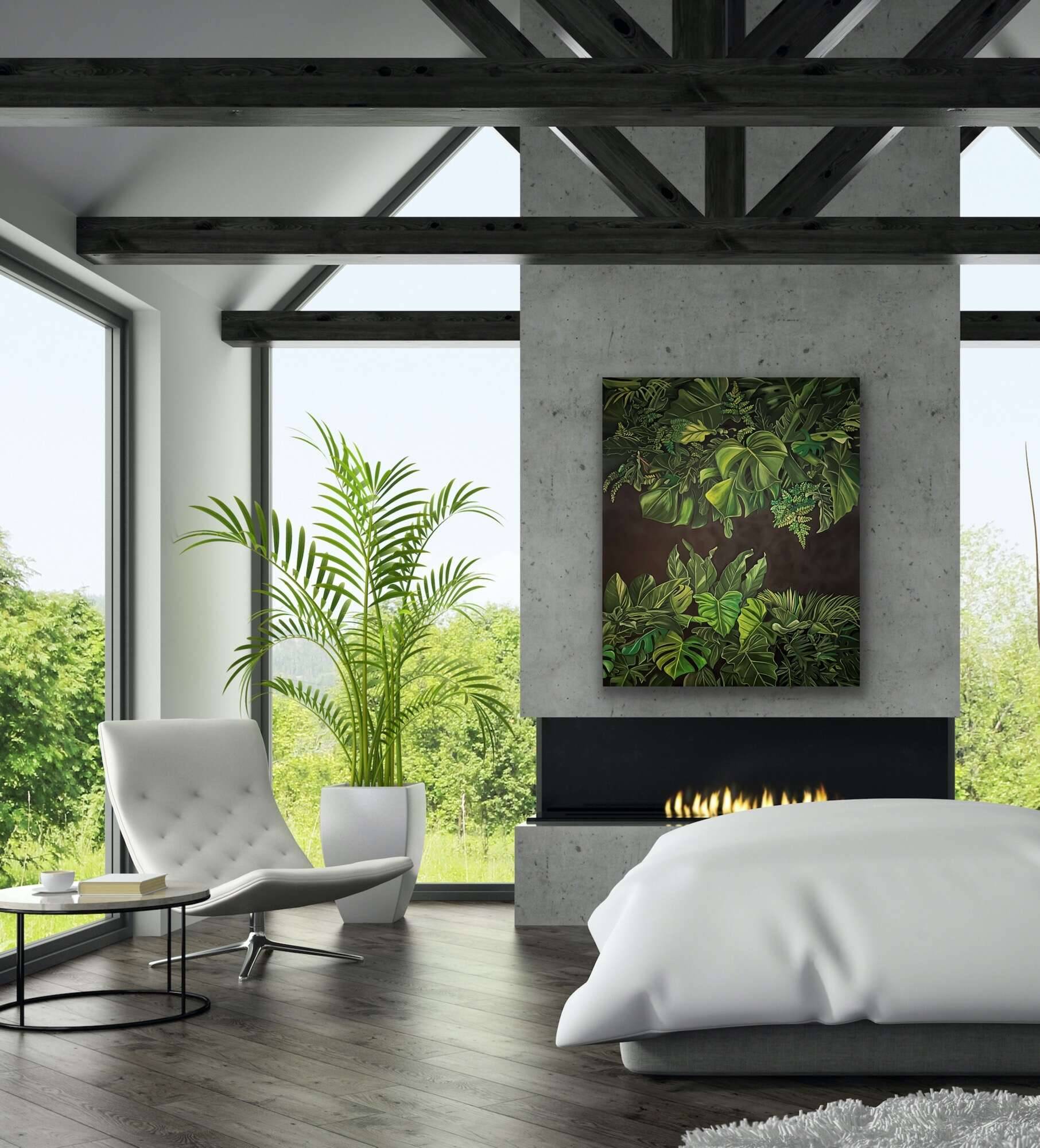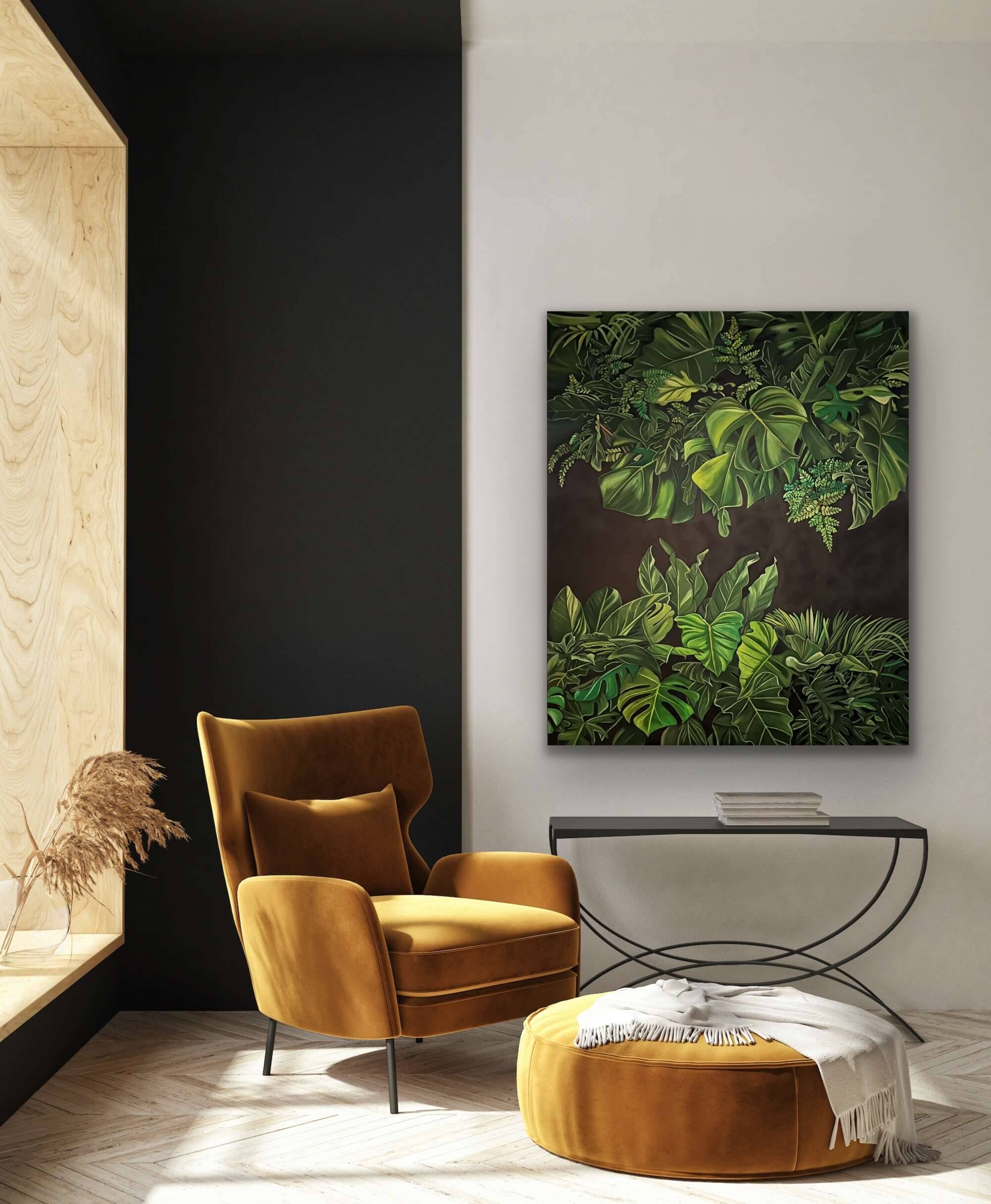 The image presents lush leaves in various shades of green, arranged against a dark background. These shapes of arcs and curves create a harmonious composition, full of dynamism and life. The colors blend smoothly, from deep green to lighter, almost yellowish accents. The atmosphere of the painting is calm yet full of life, as if we were in a corner of a tropical jungle where time slows down. The artistic technique is subtle realism with a touch of impressionism, conveying the natural beauty of the fauna. Looking at this piece, you can feel a wave of relaxation. The leaves remind us of nature and its soothing influence. The work evokes nostalgic memories of trips to botanical gardens or walks in the forest. Some might even be moved to tears. Look, how deeply nature can move us. A seven-year-old child might say: “Wow, these leaves are like in my Minecraft forest!” This painting can transport us in an instant to an equatorial paradise, where every moment is a new adventure. The composition is so well thought out that you want to search it for hidden details. My personal “refleks vincit”—it reminds me how important moments of rest among greenery are. It’s a true homage to nature.