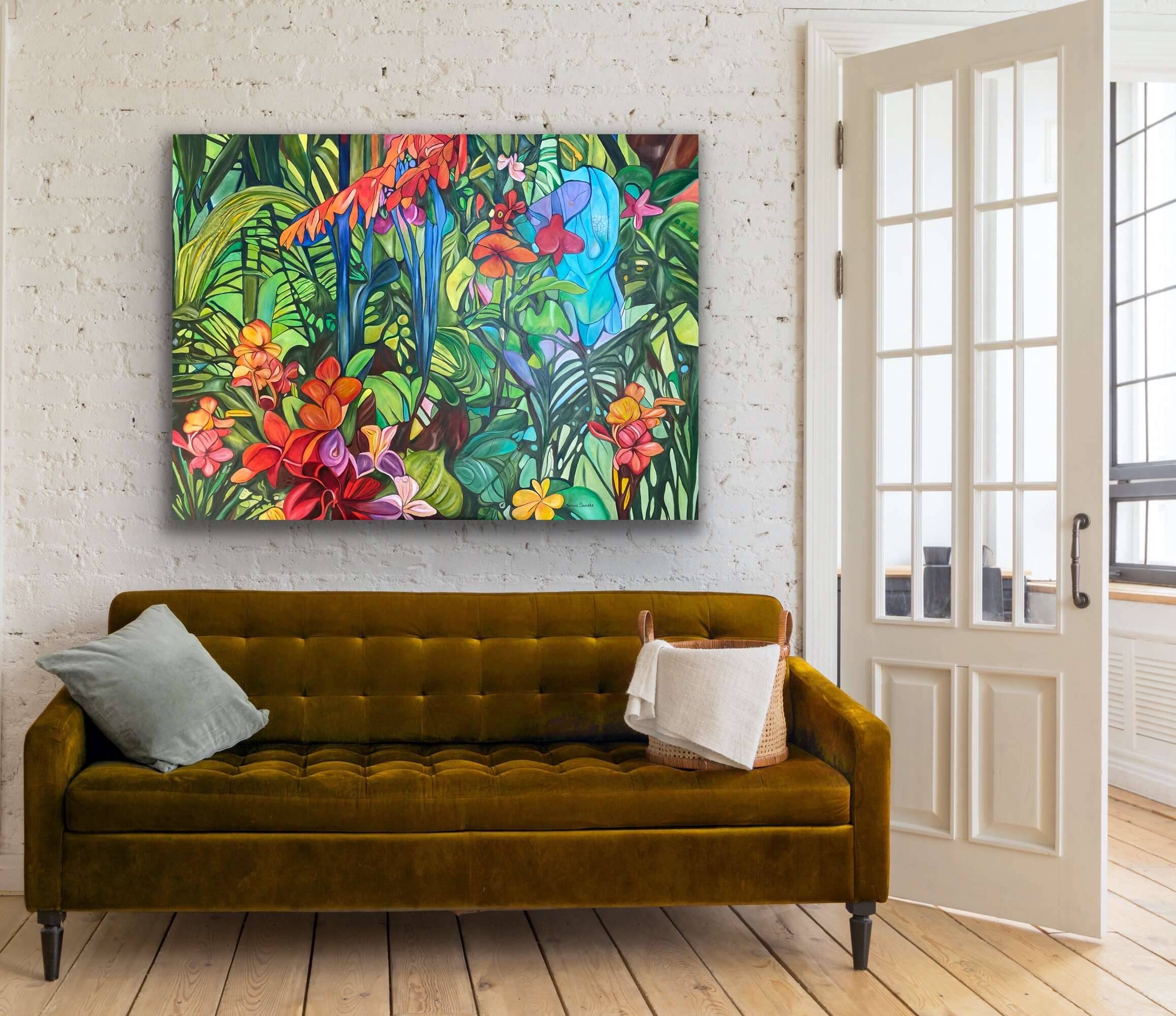 The painting bursts with life and an explosion of colors. The green of the leaves dominates, creating a backdrop that transports us to an exotic jungle. At the center, intensely red and orange flowers catch the eye, peeking out as if they wanted to say hello. Distinct, curving lines recall stained glass, and the contrasting colors make everything feel magical. The atmosphere is joyful and full of energy—you can see it right away! The artist’s style is somewhat reminiscent of Impressionism, but in a more modern, abstract vein. The use of sharp, vivid hues and bold brushstrokes creates a dynamic composition. It’s as if someone titled it “Jungle Explosion.” Looking at this painting, you can feel a breath of freshness and an energy that will wake you even on the cloudiest day. A kid would say: these flowers are straight out of a fairy tale! It lets you step away from reality for a moment and immerse yourself in a world full of color and harmony.