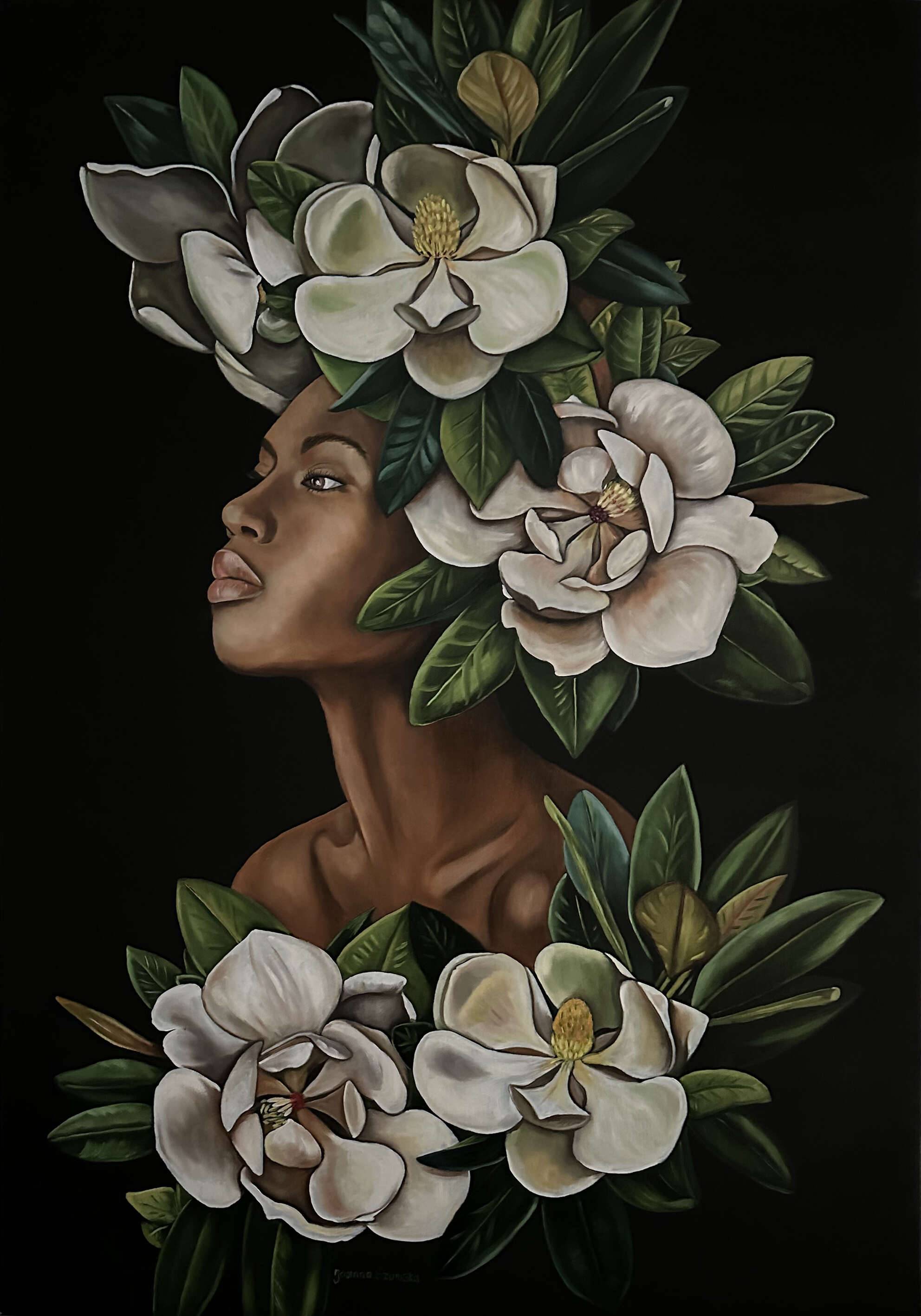 This painting is dominated by the contrast between the dark background and the vivid colors portraying a woman with magnolia flowers. The light, creamy petals subtly harmonize with the deep green of the leaves, creating a harmonious composition. The woman’s face is expressive, full of calm and elegance, as if she were looking to the future with hope. I’m struck by this fusion of nature with the human figure, which gives the impression of symbiosis. The artist used a realistic style, with great attention to detail. He surely spent a lot of time on each petal. This meticulousness reminds me of the works of Renaissance masters. And perhaps a bit of surrealism sneaks in here as well? Who knows. A masterful play of light makes the figure radiate life, even though it remains locked within a still painting. The painting prompts reflection on beauty and tranquility. Perhaps it even speaks of harmony between humans and nature? I feel a faint breath of spring, a freshness. I wanna touch those petals. A kid would say, “These flowers look like they’re from a fairy tale!” For me personally, it’s a reminder of the fragility of life and the elusive beauty that often goes unnoticed in the rush of everyday life.