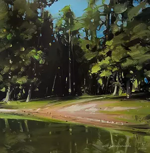 Wierzę, że w narzędziu jakiego używam do malowania mieszka moja energia. To ona jest przelewana na płótno i papier. Dzięki niej iskra za iskrą myśli przeskakują na obraz. Dlatego, gdy słońce sunie po dłoniach, kolor nieba dotyka twarzy, a ulotność jest mocą- łapię i utrwalam emocje, które pojawiają się podczas zachwytu. Malarstwa używam do narracji. Odrzucam bezosobowe przedstawienia, co w praktyce oznacza, że abstrakcję znaleźć można u mnie jedynie w charakterze tła.