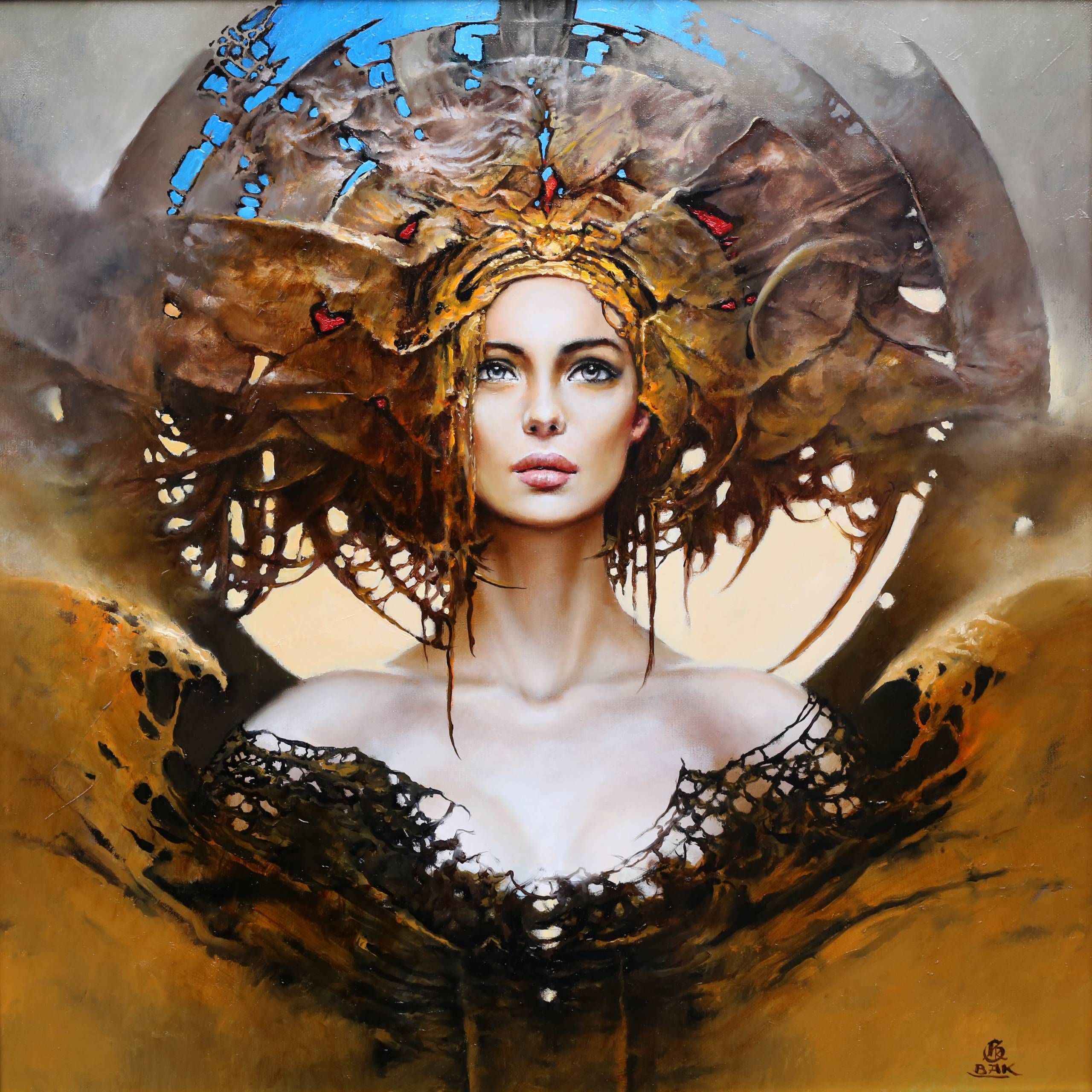 The painting shows a mysterious female figure surrounded by a majestic helmet resembling treetops. The colours of the work oscillate between gold, brown and subtle accents of blue, which gives it a unique, slightly magical character. The composition is full of asymmetrical shapes and details, which together create something like a cosmic landscape.