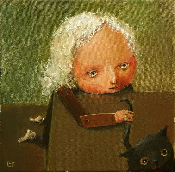 The painting captivates with its surreal composition, in which a figure with a large, bright face and piercing eyes clearly stands out. The background is muted, in dark greens and browns, which gives the scene a mysterious, at times even slightly melancholic mood. At the center is the striking face of a child, a shock of white hair framing it, seeming to stare straight at the viewer. In its hands it holds a black cat, which adds a touch of playfulness to the painting. The paint is applied in thick strokes, creating an interesting texture. This style, somewhat reminiscent of naive art, at the same time preserves an element of dreaminess and ambiguity. The atmosphere of the painting is full of contradictions. A bit like a fairy tale, a bit like a nightmare. You may feel intimidated, yet at the same time as if you wanted to peek inside because of the bodily, intriguing details. “Wow, such big eyes,” a child looking at the figure’s face would say. Every element seems to have a hidden meaning that compels reflection. Perhaps it is a tale of innocence and mystery; the cat expresses a certain kind of dream. The texture of the paint makes the image seem almost tangible, as if one could step into it. It is a true feast for the senses that lingers in the memory for a long time.