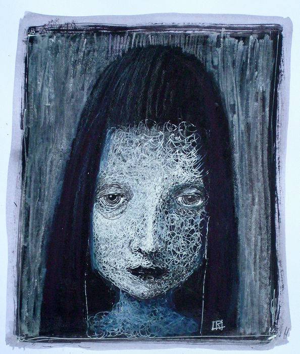 The image presents a melancholic portrait with a distinctive aesthetic. Dark tones of gray, blue, and black create a mysterious aura, and the figure seems to look straight into the viewer’s soul. The face is full of tangled lines, as if the artist wanted to capture something elusive—perhaps the complex nature of emotions? There is both chaos and order here, which makes the whole image feel like a dream, a frozen dream. The contours of the figure are elongated and blurred, adding a surreal atmosphere. It is precisely this style, reminiscent of charcoal sketches, that creates a sense of depth and unease. It even reminds me a bit of old fairy tales, the ones our grandmothers used to tell us in the evenings. I feel as if we’re just a step away from crossing the boundary from reality into sleep. What’s remarkable is how this painting stirs conflicting feelings in the viewer—curiosity, a touch of fear, and fascination. Ah, how intriguing this painting is! What truly moves me is the artist’s unique approach, using simple means to create something complex. Sad eyes against a grayed, ashen background say more than a thousand words. This work definitely leaves room for personal reflection. It is like a riddle that everyone solves in their own way. I look at it and see something beautiful, despite its stifling atmosphere.