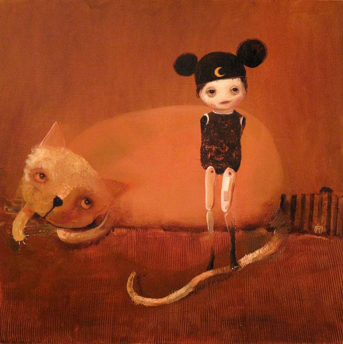 The painting seems to carry us into a surreal world of strangeness. Warm shades of brown and deep oranges dominate, wrapping the entire composition almost like an autumn mist. At its center is a peculiar childlike figure, dressed in black and wearing a cap with black ears—something out of the realm of childhood dreams. The child looks at us with gentle uncertainty, as if pondering the meaning of what they see. Beside them stretches an enormous, serene cat. Its relaxed body seems like an oasis of safety. A big cat, as if from another dimension. The atmosphere of the painting is oneiric, prompting the viewer to reflect on the boundary between waking and dream. The artist’s techniques are soft, the brushwork rendered like memories from childhood. These faded textures lend shades of nostalgia that capture the eye and the soul. Looking at this piece, one can feel a longing for something undefined—something from childhood that has been lost somewhere in time. The emotions this painting evokes can be manifold. For some it will be calm and warmth; for others, a gentle unease that always accompanies the unknown. “Look, Mom! That cat is as huge as a pillow!” a child would say, pointing at the painting with enthusiasm. Thoughts circle around magic, mystery, and childlike curiosity. There is something deeply personal here, something that summons our own memories from the times when we gazed at the world with fascination and wonder.
