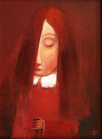 This painting radiates the warmth of red, which fills the entire composition. The dominant color interweaves with shades of brown and burgundy, creating a deep, mysterious atmosphere. The figure in the painting, with long, straight hair, seems steeped in melancholy. Her face is gently tilted and her eyes are closed, suggesting a moment of reflection or sorrow. The white shirt adds contrast, lending the whole an elegant character. The artistic style is exceptionally subtle, balancing realistic details with a more impressionistic approach to the background. The technique used by the artist appears to be oil, which lends the painting depth and intensity. The childlike simplicity of her expression may evoke associations with innocence or lost dreams. This painting, immersed in reds, evokes a range of emotions. One can feel warmth, but also despondency—a sense of “serenity,” yet also something undefined and unsettling. “It looks like a red blankie,” a child might say. The viewer may find in this work their own reflections on solitude or contemplation. It gives pause and compels reflection, inviting a longer look.