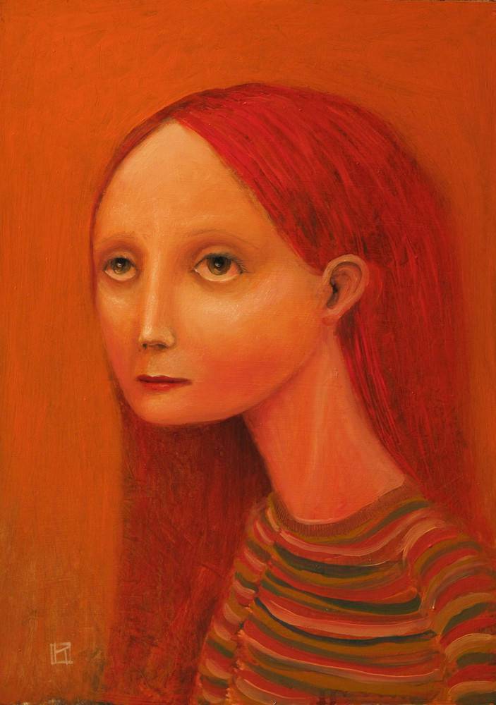 An intense orange dominates the painting, from which a figure with long red hair emerges. The girl’s face has delicate, almost fairy-tale features, and her large eyes draw the viewer’s gaze into the depths of their own thoughts. The background is a subtly worn texture in shades of orange, giving the painting a cohesive yet not monotonous space. Her striped blouse introduces a note of everydayness, contrasting with the painting’s surreal atmosphere. The overall mood is both calm and intriguing. The emotions it evokes oscillate between curiosity and melancholy. It’s like “gazing into the future,” without a clear sense of what awaits us. The painting technique recalls a slightly impressionistic approach to detail, but with a pronounced use of color contrast. The pictorial style is unique, with expressive brushstrokes that add emotional depth to every element. The artist plays with color and chiaroscuro, making the painting begin to live its own, ineffable life. The painting moves the heart and compels reflection: who is this girl, what is she thinking, what is she hiding? Such questions can flow through any observer’s mind, creating a subtle dialogue between the work and the viewer. Perhaps she was once a princess.