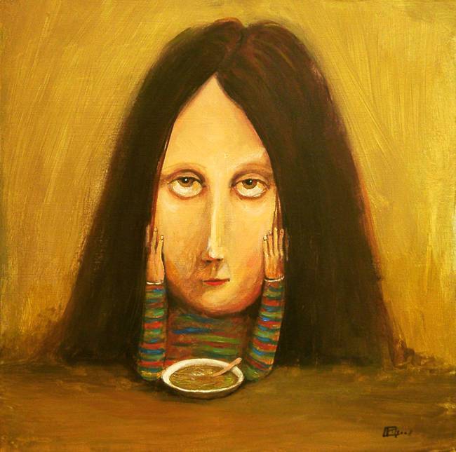 In this painting there is an enigmatic figure with long, dark hair and expressive eyes that seem to look straight into the viewer’s soul. The background is kept in warm, golden hues, creating a cozy yet slightly mysterious mood. The composition focuses on the face, giving it a monumental quality. At the bottom, we see a small plate of soup, placed in front of the person as if on the sly. The style of the painting could be described as surreal with a touch of humor, and the technique used is quite simple, with thick brushstrokes that add texture. Looking at this figure, it’s hard not to feel a certain melancholy, and at the same time a slight amusement. It may be a symbol of loneliness, or simply a moment of reflection. Or maybe not. A bit like the Mona Lisa, but with soup. The viewer may ponder the meaning of this work, or simply enjoy its intriguing atmosphere. It puts you in a contemplative mood, making you pause for a moment in the everyday rush. And I thought I was the only one who has no idea what’s going on inside. “Wow, what a strange painting,” a little boy would say. This work is a bit like a magical portal to a world full of questions and emotions.