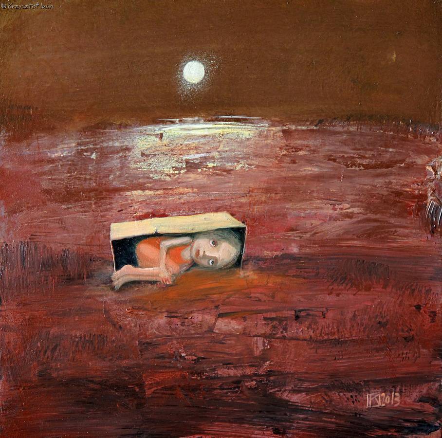 This painting exudes an astonishing blend of warm shades of brown and red, creating an almost Martian landscape in which a white, shimmering orb of light is reflected. At first glance, we see a child curled up in a small cardboard box, which immediately draws the eye. Their eyes seem to ask, “Why?” The tiny figure in the box contrasts with the surrounding space, heightening the sense of being lost. One could say this scene is an emotional roller coaster. Is that the moon? Or perhaps the sun pushing up from beyond the horizon? The artist used an impasto technique, applying paint in thick layers that add texture and depth. The background is rendered with chaotic brushstrokes, which intensify the sense of unease. The child in the box reminds me of a toy that doesn’t know why it ended up there at all. This painting certainly stirs emotions. Don’t we wonder what they are doing there all alone? Or maybe we see in them a part of ourselves, lost in the vast world. It’s a moment that compels reflection, perhaps even contemplation. What just happened, what will happen next? It’s a small, yet great question.
