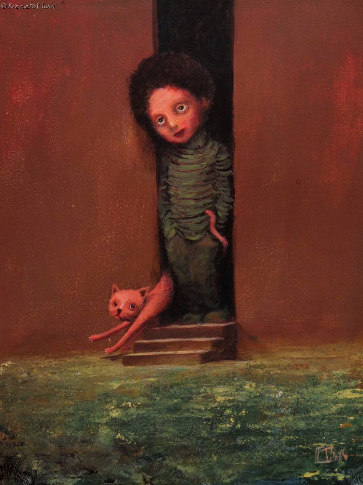 In the painting, we see a child standing in the half-light of a doorway. Their big, unnaturally large eyes draw attention, radiating surprise or perhaps a touch of sadness. In their arms, they hold an adorable pink cat with a curled tail. The background is muted in shades of brown and green, lending the whole scene a mysterious, slightly dreamy mood. The use of soft, blurred edges adds delicacy to the painting, contrasting with the child’s well-defined facial features. The atmosphere of the painting seems to be a blend of childlike innocence and surrealism. The artistic style is close to magical realism, where reality and fantasy flow seamlessly into one another. The technique is meticulously refined; the lines are soft, and the colors subtly blend into each other. The artist appears to play with conventions while drawing the viewer into their own world. Looking at the painting, one can sense a certain melancholy. Is it sadness? Or perhaps a self-portrait of expectation and longing? “It’s like a never-ending fairy tale!” the child might say. This work gives the impression that we are dealing with an illustration from a book whose protagonist is curiously peeking through a little door into another realm. There is an element of “unknown” here that leaves room for imagination. The painting seems intimate, almost personal, as if it concealed secrets that are within arm’s reach and yet just out of reach.