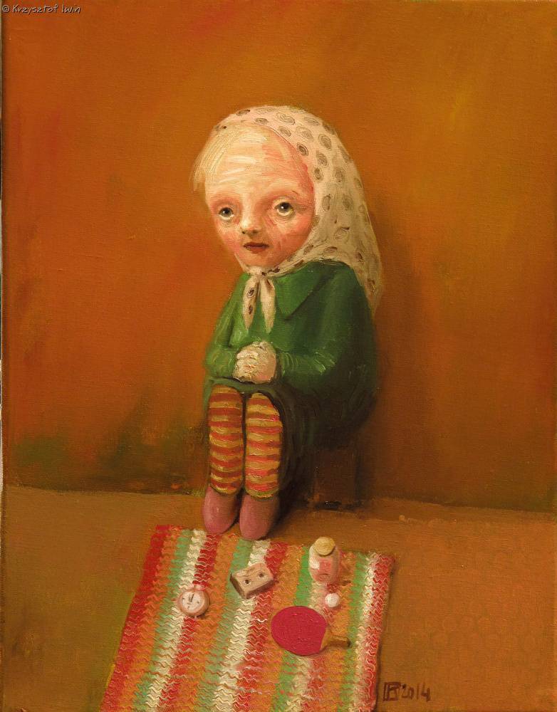 In the painting, we see a figure wearing a green coat, their head wrapped in a scarf, seated against an intense orange background. The orange shifts into warm tones, evoking a sense of nostalgia. On the ground lies a colorful striped blanket with everyday objects on it, such as a watch and plastic toys. The composition is modest, yet it is precisely this simplicity that draws attention. The style of the painting is somewhat reminiscent of a surrealist approach, with gentle, fluid brushstrokes that give the whole a dreamlike quality. The mood is a blend of nostalgia and warmth, but also a certain mystery. Viewers may feel calm and, at the same time, a slight unease. Looking at the painting, I thought the person might be recalling carefree childhood days—almost like in a fairy tale, when you watch and feel that you are part of the story. The colors and form prompt reflection on the fleeting nature of moments. It’s sweet and sour. In my opinion, you can sense that there is some deep story or memory behind this painting. The painting sparks the imagination and invites you to immerse yourself in its world.