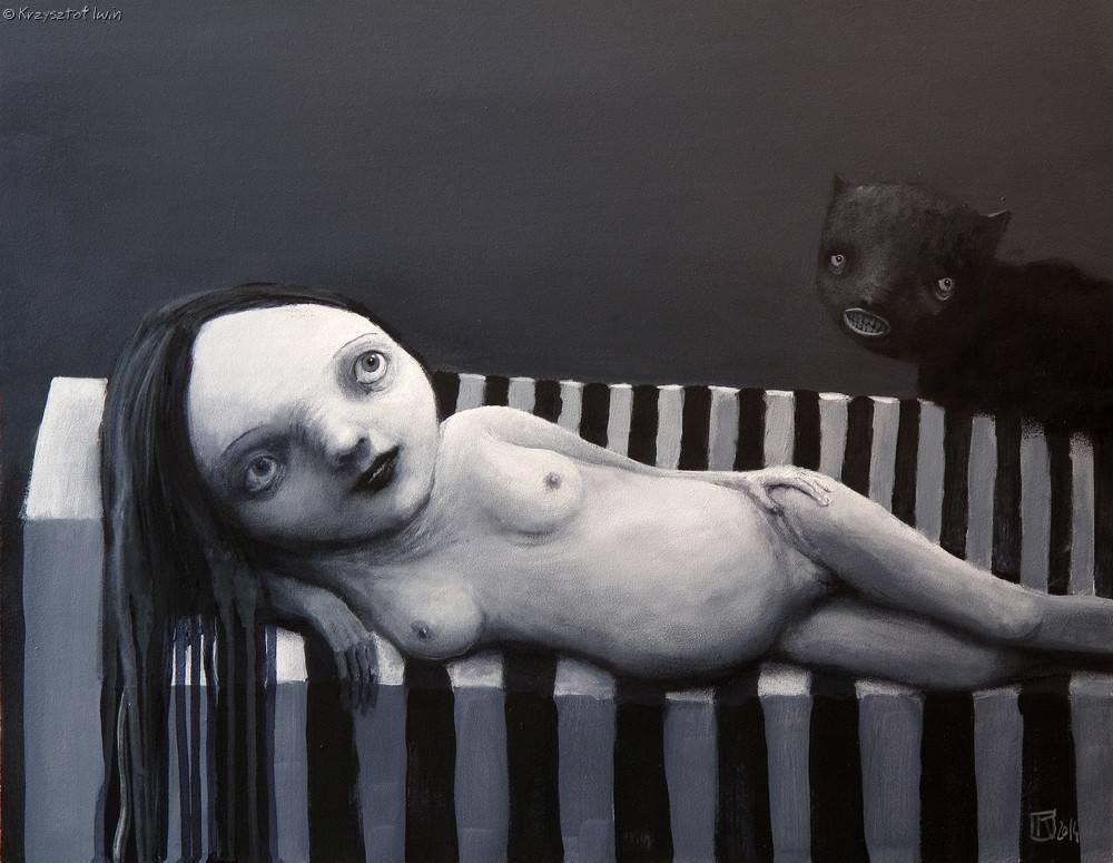 The painting depicts an intriguing scene with a surreal edge. Cool shades of gray dominate, lending it a mysterious and slightly somber mood. The figure of a reclining woman has strangely exaggerated eyes that draw the gaze and intrigue. Beside her is a black cat with its mouth wide open, adding an unsettling quality to the composition. The background is minimalist, which makes the central figures stand out even more. The atmosphere is full of mystery. You feel a certain unease, but also fascination. The artist employed techniques reminiscent of contemporary portraiture, with a touch of expressionism. One can discern a certain rawness in the irregularities of the brushwork. It’s as if the imperfections were left intentionally. As a whole, it makes the viewer pause for a moment to consider what they are really seeing. Is it a fairy tale, or perhaps a nightmare? Maybe it’s a story from a dream that lingers in the memory long after waking. “What a mystery,” one might say when looking at this work. This scene could just as well be the beginning of a tale about an intriguing relationship between a person and their dark reflection. Personally, I feel the painting tempts you to ask more questions than it gives answers. And the cat looks a bit like my black cat, who always hides under the bed.