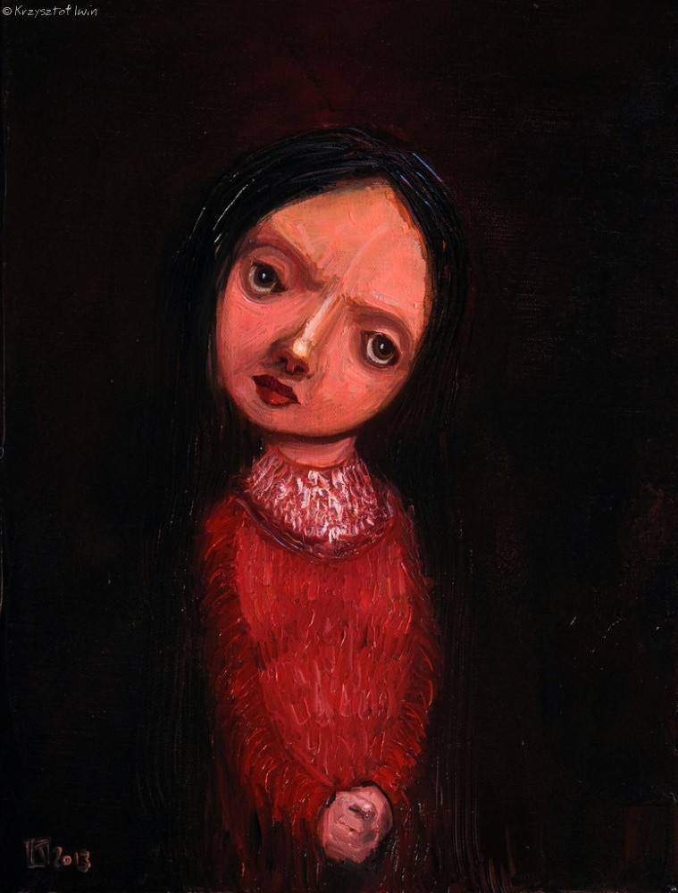 In the painting we see a figure with large eyes and an intensely red dress. Because of the dominance of dark tones in the background, full of deep browns and pure black, the figure seems to almost step out of the canvas. What stands out is the contrast between the cold light falling on the face and the warm, red hue of the clothing. The shapes are distorted, which lends the whole a surreal mood. The style of the painting is somewhat reminiscent of Expressionism with a touch of the grotesque. The artist used the impasto technique, evident in the thick brushstrokes and pronounced textures. The atmosphere? Something like a mysterious aura of things left unsaid, perhaps even a slight unease. The figure’s eyes seem to say, "I’ll tell you something," though the lips remain silent. This painting lingers in the memory, because although it seems simple, it is full of uncanniness and mysteries. For me, looking at this painting brings back childhood—the days when it seemed to me that toys had secrets. "She looks like my doll!"—that’s how, in a childlike way, one could sum up the impressions of a seven-year-old viewer. The painting intrigues, prompts reflection, and stirs questions in the heart that may not even need answers. This is exactly that "wow" moment in art, when you look at something and can’t tear your eyes away.