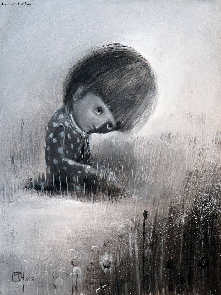 The painting depicts a child with large, piercing eyes, immersed among gently undulating grass. Muted shades of gray dominate, creating a calm yet slightly melancholic mood. The lines are soft, and the whole scene feels as if it were part of a dreamlike landscape. The artist has used a blurring technique here, which adds a sense of mystery. The child seems somewhat pensive, perhaps even lost in their thoughts. Wow, what big eyes it has! The composition is interesting because, though central, it is modest, which draws the eye. The painting technique known as “impasto” gives the image structure; you can almost feel the texture of the grass. Interestingly, despite its simplicity, the painting immediately stirs emotions. Perhaps it’s nostalgia, or perhaps childlike innocence? A bit magical, a bit sad. Or maybe it went like this: the artist decided to capture a moment of contemplation that we all carry within us. I find myself dreaming a little of returning to such a childlike world. The work prompts reflection on nature, on innocence. This painting is a little “mystery” that each person must solve on their own.