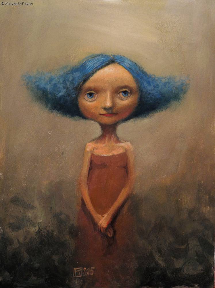 The painting depicts a girl with blue hair that seems to ripple around her head like a cloud of dreams. Her eyes are wide open and full of curiosity. The background is tranquil, rendered in warm, earthy tones, which lends the whole a sense of assurance and a soothing mood. The composition is fairly minimalist, focused on the central figure, which heightens the feeling of intimacy. The artist’s style is somewhat surreal, reminiscent of the impasto technique, where texture plays a key role. The “storm” of hair around the girl’s head creates a contrast with her delicate face, drawing the viewer’s gaze. It evokes in the viewer a note of nostalgia and, at the same time, a certain intrigue. “The lady’s hair is like a little blue cloud,” a child might say, noticing something unusual that often escapes adults. Altogether, it makes us feel a bit as if we were in a magical world where reality meets rêverie. It may seem that the girl is gazing straight into the viewer’s soul, which stirs a certain emotion. This figure, though calm and still, radiates an energy of “curiosity,” compelling us to wonder what lies behind that blue gaze.