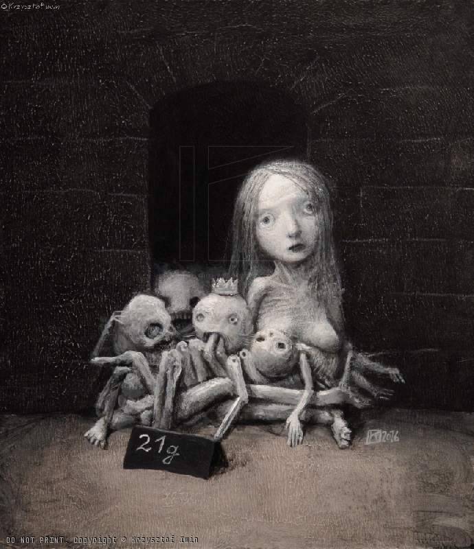 The painting captivates with its dark color palette. Grays and deep blacks dominate, lending it a mysterious atmosphere. The figures are unsettling: mostly gray, they resemble fragile, ethereal beings. Their long, delicate limbs seem intertwined in a chaotic mass. The composition draws the eye to the central figure, whose expression emanates sadness and a sense of being lost. The whole thing gives the impression that we are peering into her soul, which makes the viewer feel a bit ikke, as if intruding on something personal. The atmosphere of the painting is heavy, even melancholic. The artist’s style is exceptionally subtle and detailed, reminiscent of classic charcoal drawing techniques, which underscores the contrast between delicacy and darkness. One could say there is a certain fragility in this chaos, like a childhood rhyme that soothes and unsettles at the same time. Emotions? Well, it’s that strange feeling between sadness and fascination. Such a painting may elicit mixed reactions—some will feel unease, others may discover beauty in distortion. When you look at what the figures have before them—a sign reading "21g"—you can discern references to the legend of the weight of the human soul. The whole is like a riddle—concealing its meaning without revealing too much. Looking at it, it’s easy to drift into thought, trying to guess what the artist truly wanted to tell us. It’s a painting that invites reflection and the discovery of ever new layers of meaning.