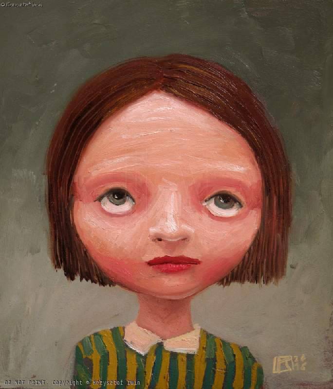 The image depicts the face of a child with large, expressive eyes that seem to gaze into the distance. Warm shades of brown and pink dominate, giving the work a cozy, though slightly melancholic mood. The background is subtle, with delicate shades of gray that highlight the central figure. The composition is simple but exceptionally captivating, focused on the face, with only a fragment of the torso visible, clad in green-and-yellow stripes. As if that mattered. The atmosphere of the painting is nostalgic, and the painterly technique suggests the use of thick brushstrokes that add depth and life to the texture. The style is somewhat naive, which lends it charm and prompts reflection on childhood and innocence. The work evokes a mix of emotions—from warm sentiment to a gentle sadness. I wonder what lies behind those eyes. Could it be a longing for something lost? Looking at this painting, one can feel a strange yearning. Or is it just me? As they say: “Eyes are the windows to the soul.” Little Johnny would probably say that the child is either sad or in the mood for ice cream. It’s something that stays in the memory.
