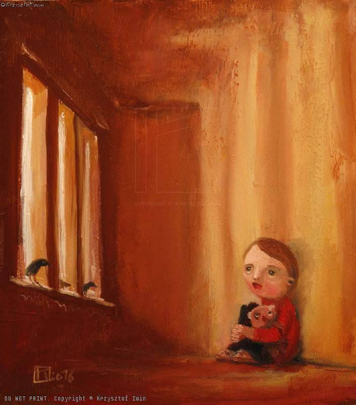 The painting is dominated by a warm palette of browns and reds, creating an intimate and slightly melancholic mood. A small child, hugging a stuffed animal, sits in the corner of the room. Light coming through the window falls gently across the wall, casting soft shadows and highlighting the texture of the paint. The composition centers attention on the child, and in the background birds can be seen perched on the windowsill. The atmosphere of the painting feels contemplative, as if time had slowed down. There is something moving about this moment; the child looks pensive, perhaps even a little worried. Is the child waiting for someone who will not come? The artistic style is close to expressionism. The brushstrokes are visible, adding dynamism to the painting despite its static composition. For the viewer, it may evoke a sense of warmth, but also a subtle sadness. I think it is a painting about longing or loneliness. The color palette is both warm and mysterious. And then the birds on the windowsill seem like the guardians of his little world. Small details, like the child’s gaze, let you lose yourself in it for longer. This painting would probably make me smile if I had it in my childhood room. “Look, Mom, the little birds are watching over me too!” I admit, putting myself in the child’s place, I feel this painting come to life anew.