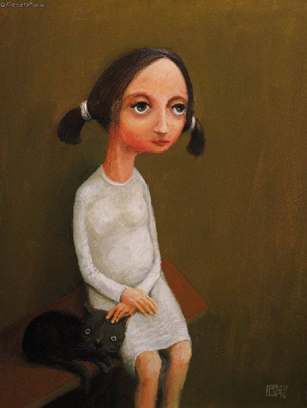 In the painting, a girl with large, expressive eyes sits on a bench next to a black cat. The colors are muted, dominated by browns and beiges that create a calm, almost melancholic mood. The girl’s figure is elongated, giving her an unusual silhouette and a stylized appearance. The painting is minimalist, and the simplicity of the composition draws attention to the details — those huge eyes of the girl are almost hypnotic. The expression on her face may seem pensive, a bit sad, or perhaps just tired? Who knows. The artist used delicate brushstrokes to create an impression of soft textures, adding subtle, warm tones. The painting technique is gentle, with an emphasis on emotional impact — the painting emanates "calmness." It may evoke a sense of nostalgia, recalling moments from childhood. “The girl has funny hair” — that’s probably how a young viewer would put it. The painting prompts reflection. Is she lonely, or simply contemplating her own thoughts? Every element, from the pose to the shadows, builds a narrative, opening a window onto an unknown yet strangely familiar world. It stirs a gentle longing while remaining soothing in its simplicity.