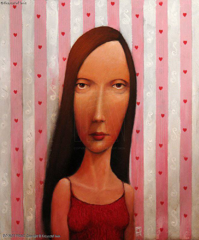 An intense palette of warm colors dominates this painting. The background stands out with pastel pink and white stripes, scattered with tiny red hearts that give the composition a slightly childlike charm. The figure of a woman, centrally placed, draws the eye with her elongated, slender face and serious expression. Her hair, dark and glossy, falls smoothly over her shoulders. There is a certain mystery hidden in this peculiar face, which can be interpreted as a deliberate contrast to the somewhat infantile background. A feeling of unease mingles with a kind of nostalgia, as if the painting were recalling old, unsettling fairy tales. I wonder what this lady is thinking, don’t you? The painting’s style is reminiscent of Surrealism, where reality blends with fantasy. Strong lines and pronounced shadows accentuate the melancholic mood. The artist uses simple yet expressive techniques that strengthen the emotional message. “Fascinating” is the word that comes to mind. It arouses feelings of unease as well as curiosity. It may somewhat resemble Tim Burton’s style, where strangeness becomes beauty. One might say that the painting speaks of loneliness in a crowd or hidden emotions, but that depends on individual perception. The sun in the sky that delights the birds!