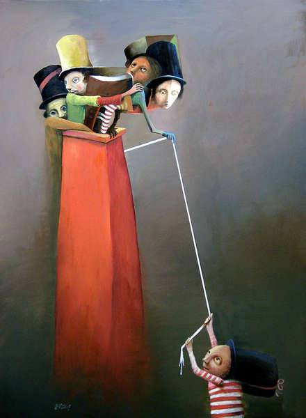 In the painting we see a mysterious scene where figures with elongated silhouettes and bizarre proportions float in a surreal space. A dark color palette dominates, with accents of red, green, and yellow that draw the eye. The composition is vertical, with a centrally placed figure who seems to be the guide of this intriguing group. The mood of the painting is slightly unsettling, yet at the same time fascinating. The spirit of absurdity mingles here with a subtle melancholy. The artistic style is somewhat reminiscent of surrealism and expressionism, with a touch of a comic-book feel. Techniques such as bold outlines and smooth color transitions add dynamism. The work can evoke various emotions—from astonishment to admiration. The viewer may wonder what this scene symbolizes and what secrets each figure conceals. Curiosity and contemplation are natural reactions to this intriguing world. A kid would say, “It’s funny, but such weird little people.” Personally, I feel this painting transports me to another world. It prompts reflection on the different masks we wear every day. You’re left pondering: what’s next? The painting’s atmosphere draws you in and doesn’t let go, leaving questions in your mind that we ourselves have to answer.