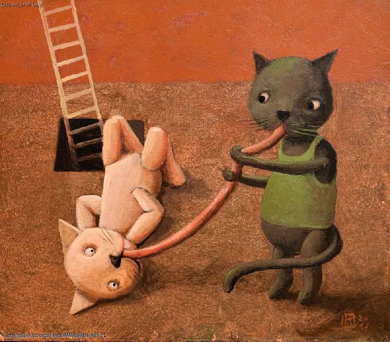 The painting brims with life, though that may sound strange, because it depicts two cats, one of which is clumsily playing with a long rope. The colors are muted, dominated by browns and greens that give a sense of nostalgia. The composition focuses on the center of the painting, where the cats draw our attention, while a mysterious ladder appears in the background. There is humor here, something along the lines of “is this really a good idea?” Stylistically, the artist used a technique that evokes children’s book illustrations, with clear outlines and a somewhat naive rendering of the figures. The atmosphere is slightly surreal. I feel scenes like this are taken from a dream, where logic has no access. It can make the viewer laugh, but also stir a certain unease tied to a childlike lack of understanding of the limits of ideas. A black cat in a green top looks on in surprise and adorably tilts its head, as if saying “what’s going on?” For a 7-year-old child: This one kitty wants to be like Superman and fly! Isn’t that funny? The painting is full of emotion. It may seem that the cats are cooking up some mischievous plan. My associations revolve around childhood and carefree play. What is delightful is the artist’s ability to capture simplicity and nonchalance in such a clumsy way that it evokes warm feelings.