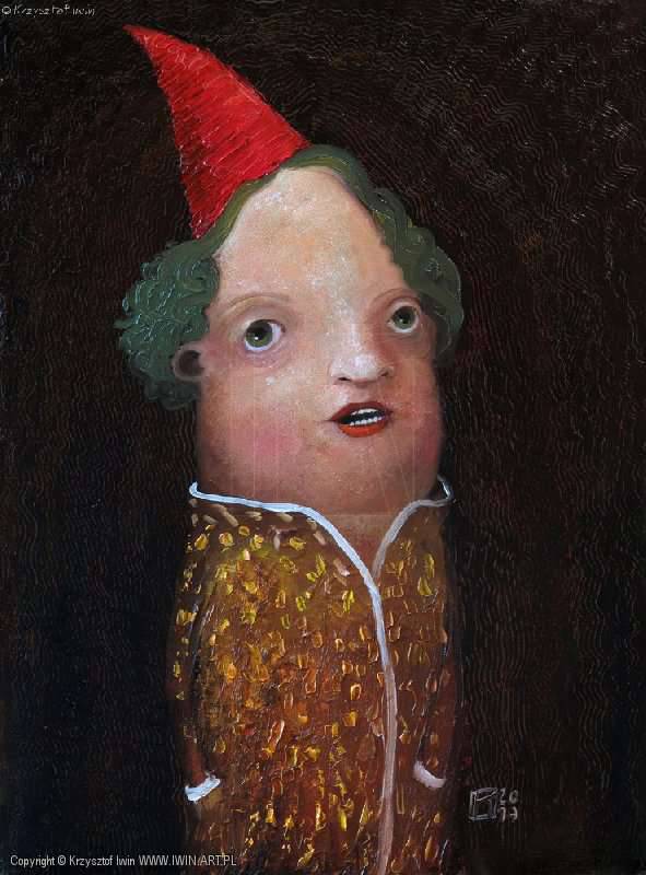 In the painting we see a figure with an unusual appearance, somewhat reminiscent of a fairy-tale gnome. The dark background contrasts with the figure dressed in a red, shiny hat and a sequined jacket. Their curly hair is in shades of green, and their enormous eyes seem to gaze into the distance with surprise. It’s as if a child were trying to describe a magical friend: “It looks like a gnome from my book!” The atmosphere of the painting is intriguing. You can sense a bit of unease, perhaps because of those large eyes that seem to be hiding something. The mood is both comical and mysterious. It’s a curious blend of fantasy and strangeness. The painting technique alludes to surrealism. Refined details and texture add depth to the work. The colors are saturated, and the contrast is strong. The emotions this painting may evoke are varied. It can amuse, but also prompt reflection on what we are actually seeing. Every viewer may see something different here. For me, this figure is a metaphor for a child’s imagination—full of wonders and surprises. Indeed, the painting draws you in and lingers in the memory. It seems to say: “the world is full of magic; you just have to notice it.”