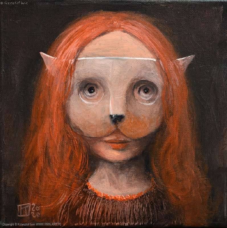 The painting depicts a person with a face resembling an animal mask, perhaps a cat. The hair has an intense, reddish hue, long and softly falling over the shoulders. The background is dark and moody, creating an intriguing contrast with the brightness of the face. The composition is centered, drawing our attention to the figure. The atmosphere the work emanates is mysterious and a little unsettling. You can feel as if something magical were floating in the air. Do you feel that tension? The artistic techniques used by the creator suggest a blend of realism with elements of surrealism. The brushstrokes are pronounced and painterly, revealing delicate details and textures. It scares me a little, yet fascinates me at the same time. The interpretation is open—one senses a certain transgression between the human and animal worlds. To a child, it might look like a character from a fairy tale. Its gaze, full of surprising depth, seems to follow our every move, as if it wanted to tell something, but silence holds it back. This manner in which fantasy meets reality is simply captivating! Basically, such an image provokes a multitude of thoughts and emotions, revealing various human and feline aspects.