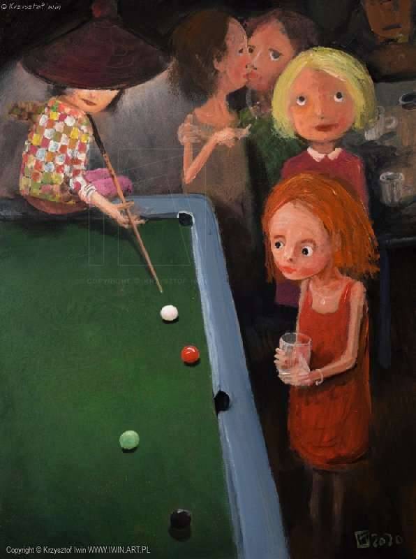 In the painting we see a game of billiards, and at the center of attention are figures with slightly deformed proportions, which lends the scene a slightly surreal character. The dominant colors are the deep greens of the billiard table, contrasted with the light hues of the figures’ clothing. The play of light and shadow creates an intimate, somewhat melancholy mood. It is evident that the artist is playing with a technique of mixing acrylic with oil, which produces the effect of thick brushstrokes. Looking at the childlike face of the red-haired girl holding a glass, one can feel the curiosity and mystery lurking in the pub’s atmosphere. Will this man win? One wonders what a seven-year-old might think: “I want to play too, Mom!” The painting attracts the eye with its simplicity, yet the longer you look, the more emotions you begin to notice. That intrigue! Perhaps even the absurdity of a situation in which children watch adults reminds us of the balance between the adult world and childhood. Surprisingly profound at first glance, this painting lingers in the memory for its magical everydayness.