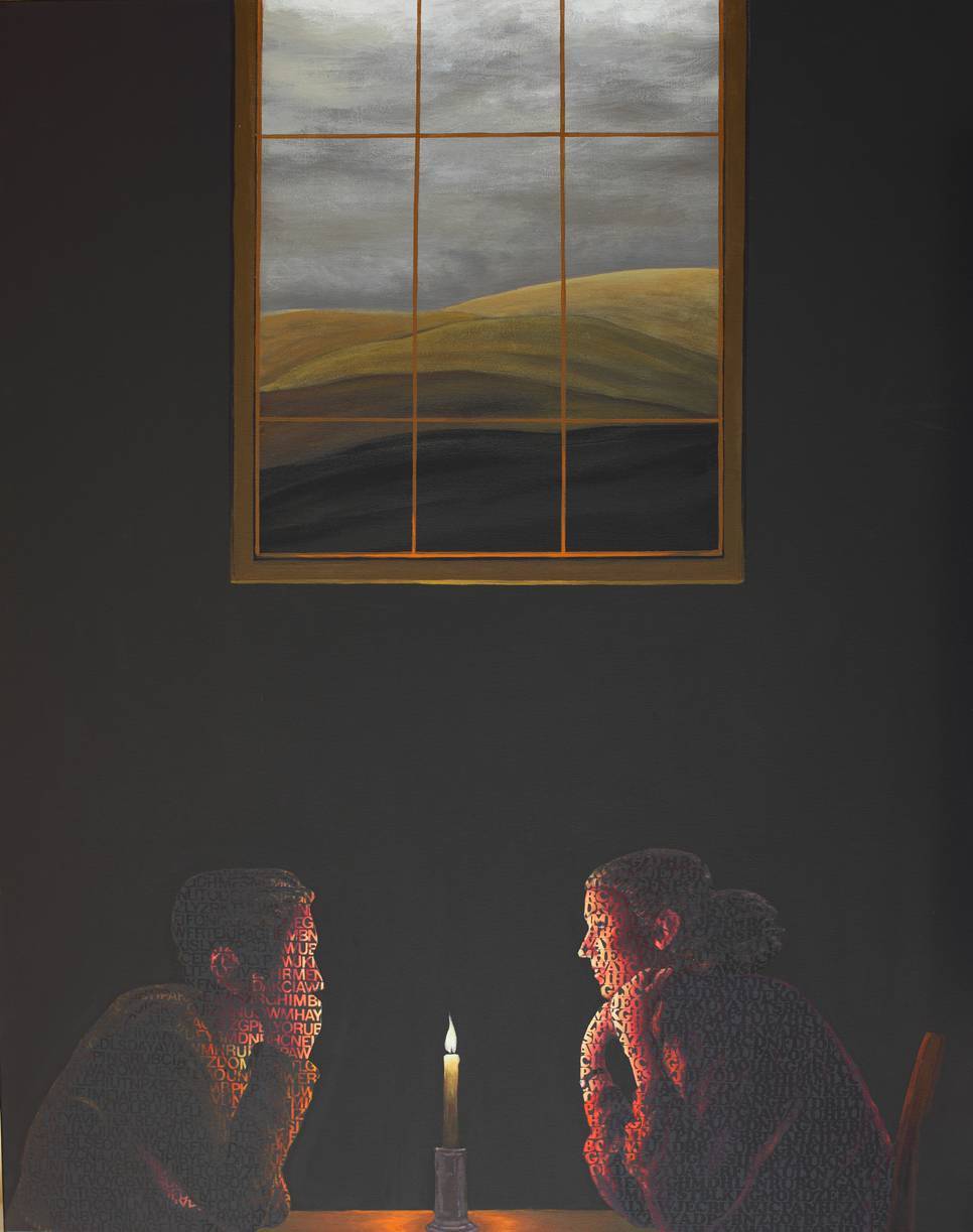 The painting shows a couple sitting across from each other by candlelight. The warm candlelight illuminates their faces, creating a pleasant, intimate mood. Behind them is a window through which a cloudy landscape can be seen, which lends the scene a slightly melancholic atmosphere. The colors are muted, dominated by darkness and warm tones, which underscores the mystery and calm. The artist employed interesting techniques, using the play of light and shadow to focus our attention on the figures. Their faces are adorned with patterns reminiscent of swirls and flourishes, giving them an almost magical appearance. This gives the painting a unique character, something out of a dream. The painting evokes feelings of contemplation and calm. One might wonder what they’re talking about, what secrets they share. Perhaps it’s a story of loss, or perhaps something joyful? A kid would say, “Wow, they’re glowing like ghosts!” In my opinion, this painting is like a portal to another world, where time flows more slowly. It’s interesting how a single simple candle can change the entire mood. It illustrates the power of small, everyday things that can have enormous significance. This contrast between the inner warmth and the cold outside the window is like in life, when feelings warm the heart despite difficult times.