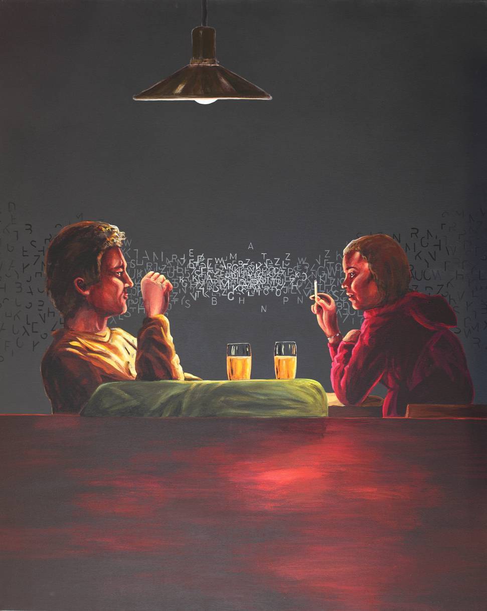 In the painting, we see two people sitting across from each other at a table, illuminated by the warm light of a lamp. The background sinks into deep black, which adds a sense of mystery. Shades of red and brown dominate, interwoven with cooler tones. The figures seem to be engaged in an intense conversation, perhaps even a somewhat philosophical one. Letters float between them, as if their words were materializing in the space. Such a depiction symbolizes the power of communication and the exchange of ideas. The painting emanates calm, yet it intrigues at the same time. You feel a bit like an observer in an unusual place. You find yourself wondering what important thing they might be discussing. The technique the artist used is somewhat reminiscent of old-school realist painting with a strong emphasis on chiaroscuro. Except that the added abstract layer of letters introduces a modern element. The work can evoke various emotions. Calm, reflection, or perhaps even the sense that we are witnessing something magical. After all, it’s as if grand words are turning into real entities. “It’s like in a magic forest!” a seven-year-old would probably say. Personally, when I look at it, I feel how that “connection” between the figures becomes almost tangible. The painting has that elusive charm that stays with you for a long time.