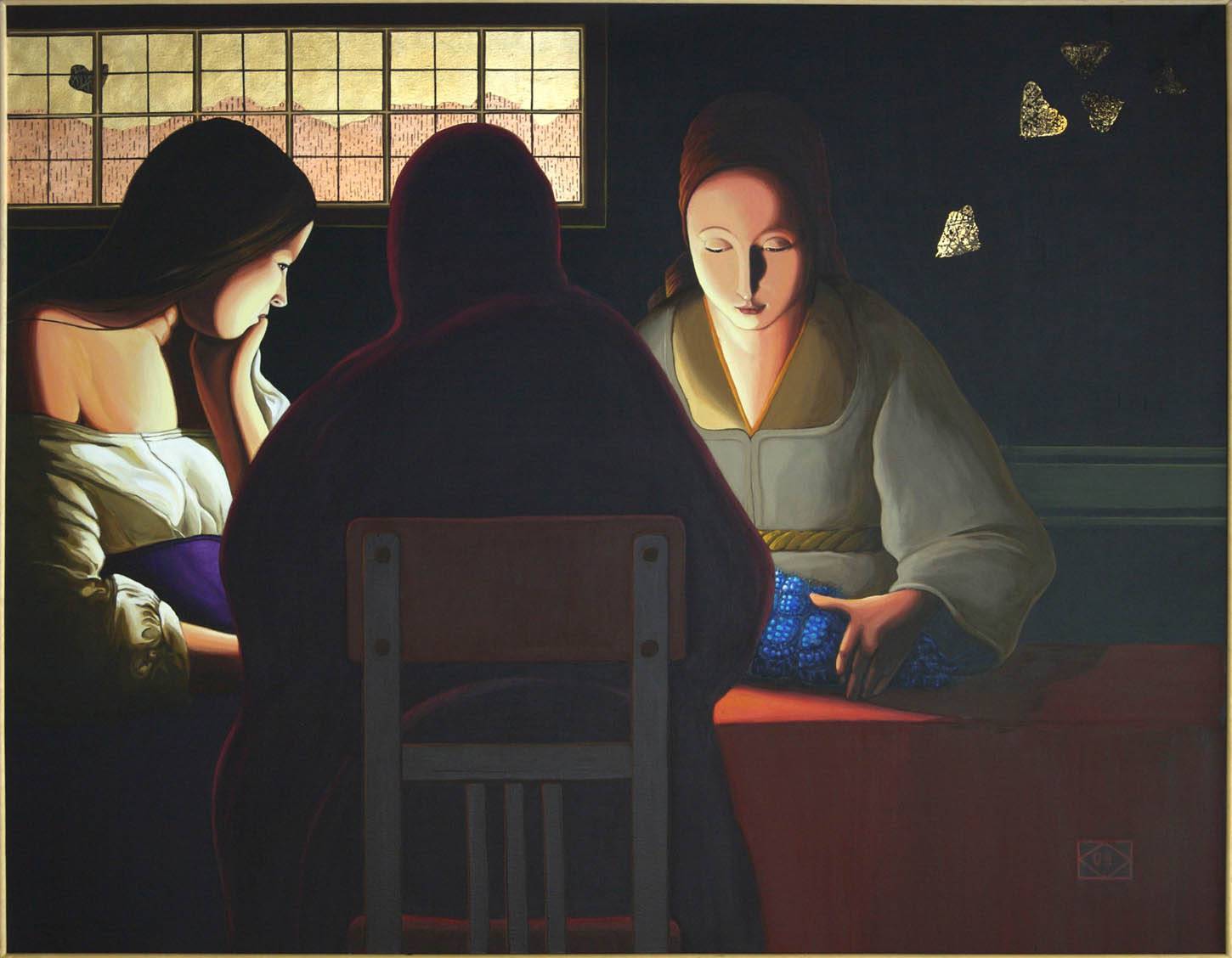 The painting exudes calm and mystery, drawing the eye with a subtle palette of colors. The play of light dominates here; warm shades of gold and brown intertwine with the cool light streaming through the window. The figures seated at the table are immersed in semi-darkness, which lends the scene an intimacy. The compositional layout is simple yet deliberate, evoking the old European school of portraiture. The painter successfully employs contrasts of light to create a sense of depth and mystery. Details such as the delicate folds of the fabrics or the subtle shadows on the face underscore the artist’s masterful brushwork. And those butterflies, golden and light, add a note of magic, as if dispersing the silence of the moment. The painting can evoke various emotions. It may be nostalgia for the simplicity of days gone by, a reflection on the warmth of family bonds, or simply the pleasure of communing with the beauty of art. “It’s like a story waiting to be told,” one might say, looking at this scene. For a seven-year-old, it might be: “I once saw two angels in the dark.” Looking at the painting, one can ponder how art can speak to us in the simplest yet most moving way. What do you feel when you see this painting?