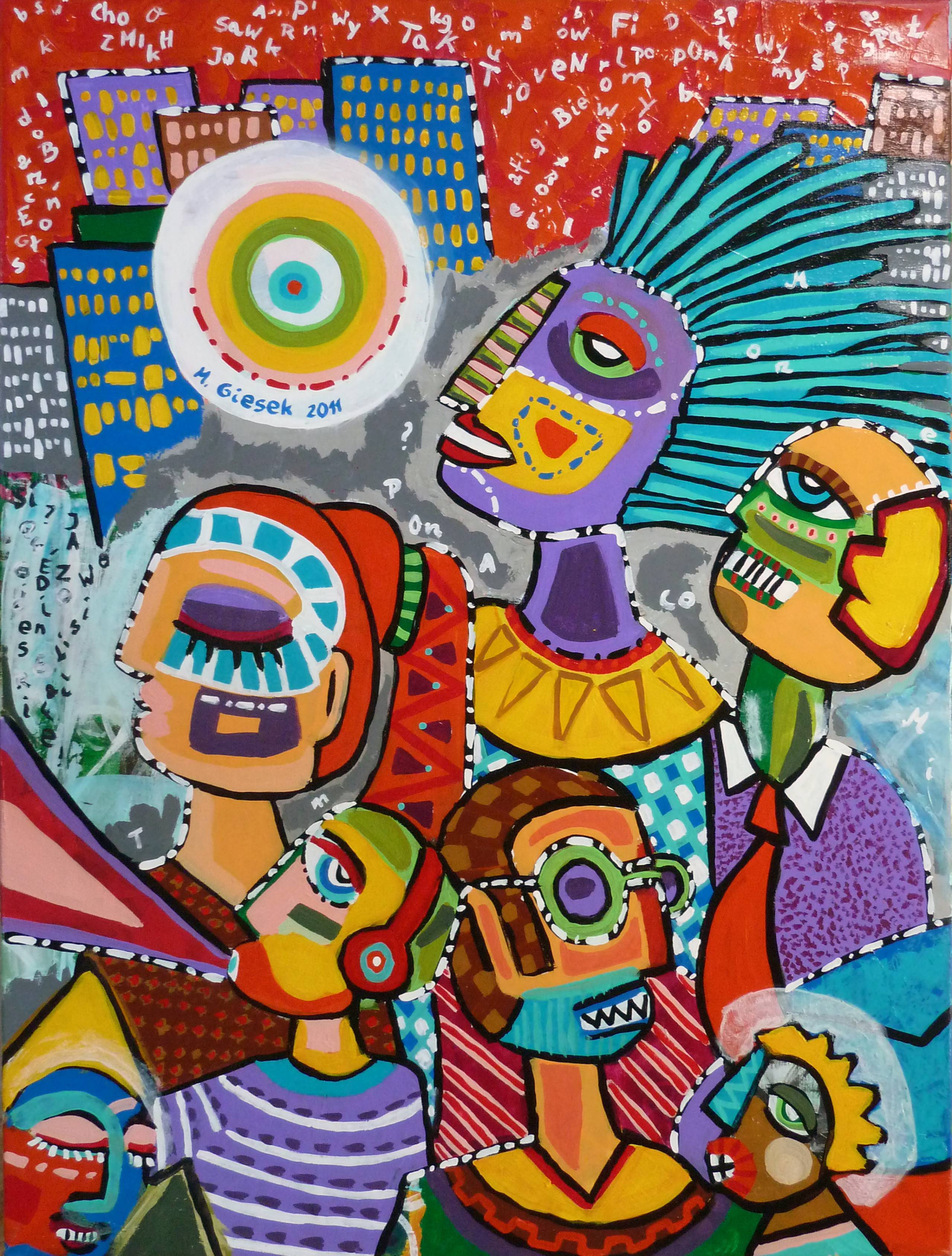 A riot of colors dominates the painting—juicy reds, intense blues, green stripes, and orange patches create a vibrant mosaic. Human figures with abstract shapes resemble familiar characters from comics or cartoons. Each face seems to say “look at me” with its unique, geometric arrangement. One of the faces has blue stripes like a zebra! A background full of letters and symbols gives the painting dynamism. The mood is eclectic—somewhat like at an amusement park, where chaos meets harmony. The artist employs techniques characteristic of pop art, mixing diverse shapes with vivid colors. The painting may evoke a sense of joy and curiosity in the viewer. It intrigues, prompting you to ponder the story behind each character. The composition is like a kaleidoscope, full of mystery and surprises. Wow, it feels as if this painting is pulsing, living a life of its own! In a word: captivating. That’s how I feel looking at it. My heart beats faster, and my mind wonders what lies behind these colorful beings.