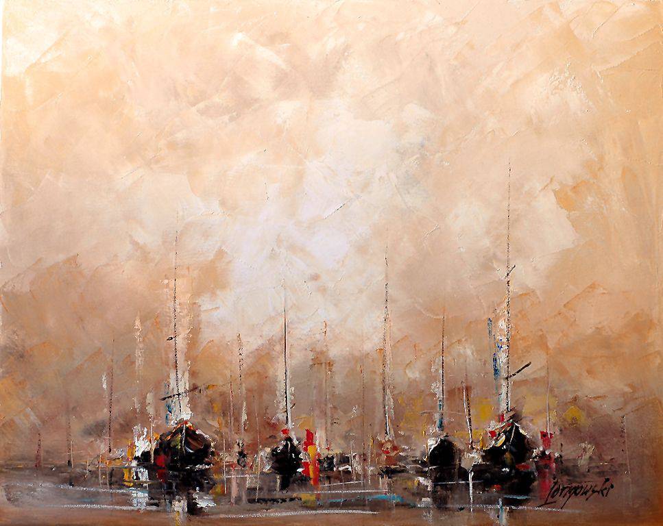 The painting emanates serenity and mystery. Soft, pastel shades of beige and brown dominate, creating a cozy, almost melancholic atmosphere. In the foreground we see blurred silhouettes of boats on the water, barely noticeable, as if they were only a dream or a memory. Those slender, vertical shapes of the masts add elegance and lightness to the composition. The space in the painting feels endless, and the use of delicate, slightly chaotic brushstrokes suggests the subtle movement of wind or waves. The artist employed an impressionist technique, capturing the fleetingness of the moment, as if to say: "the here and now is what matters most." The interweaving colors and the lightness of the stroke give the piece an ethereal character. Is it the bustle of a harbor in the morning glow, or the silence after a storm? For me, it’s an in-between moment, full of unspoken hints. The painting awakens in me a longing for the sea. I thought I would gladly go out on such a little boat and sail far away, to where only the horizon can be seen. And although the colors are subdued, their interplay recalls the warmth of a setting sun, giving a sense of peace and safety. "Boats are great fun!" is probably what any little kid would think. This work seems to whisper: "Pause for a moment, feel this moment." And as I look at it, I truly feel my heart beating more calmly. Sometimes the simplest things are the most beautiful, right?