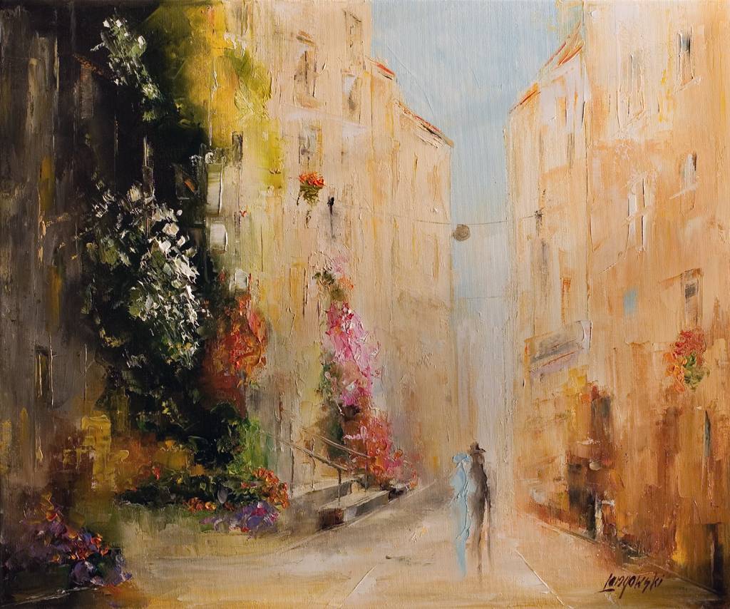 The painting emanates a subtle warmth. The background is filled with light beiges and delicate pastels—just as if the sun were filtering through the clouds. Exquisite flowers in shades of pink and red add life, contrasting with the soft silhouettes of buildings. The composition guides our gaze toward the human figure, whose blurred contours give the work a dreamlike character. It seems the artist prefers impasto, as the texture of the paint is evident and the brushstrokes are dynamic and lively. This painting is like an old memory, a childhood recollection? I think so. I see here calm and everyday life that suddenly becomes magical. Like a child saying, “Mom, here I come!” From afar, the scent of a summer stroll drifts in. The atmosphere is slightly nostalgic, perhaps even melancholic, yet it radiates positive energy. Personal reflections? Hmm, it reminds me of a moment when, with a cup of coffee, I sat on a small side street and watched the world around me. Every flower, every shadow draws the eye and prompts reflection. An extraordinary painting full of emotion.