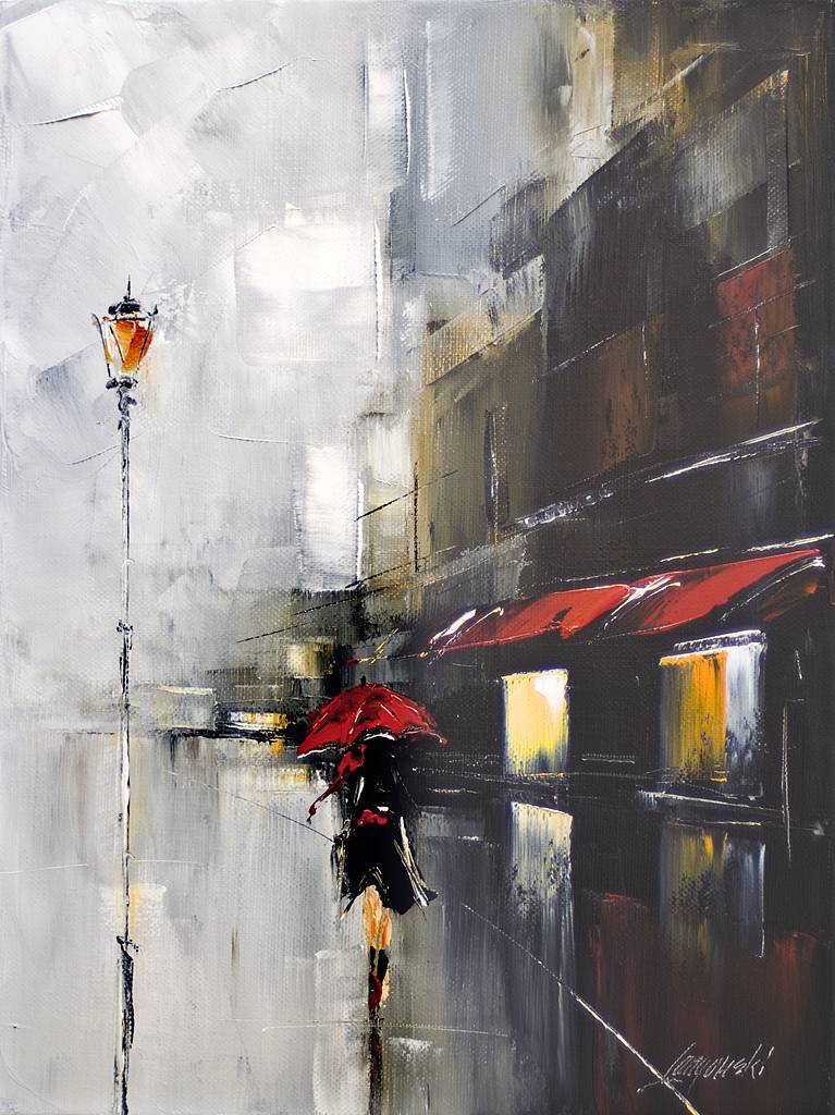 In the painting we see a rainy day, with cool, icy hues dominating the background, while the red of the umbrella draws the eye with its contrast. The gray of the sky and buildings creates a misty, melancholy atmosphere, almost like a dream. Who is she? A lone figure on the street, as if hidden from the world. The artist used the impasto technique, which adds depth to the texture. Is it romantic or rather sad? Perhaps she’s seeking shelter, or maybe she’s simply enjoying a moment of quiet. Children would say: “Oh wow, that lady has a pretty umbrella!” The view is blurred, as if we were looking through a wet windowpane. Dynamic brushstrokes convey the movement and energy of the city. The lines of the lampposts and buildings are straight, but their reflections on the wet pavement create subtle, blurred shapes. It’s something like a blend of the realistic world with a touch of the abstract. I feel a certain nostalgia when I look at this piece. It’s amazing how the artist captured the moment. You feel that calm, but also the unease lurking around the corner of the street. It stirs a slight tension, and at the same time it calms me. As if time had stopped for a moment.