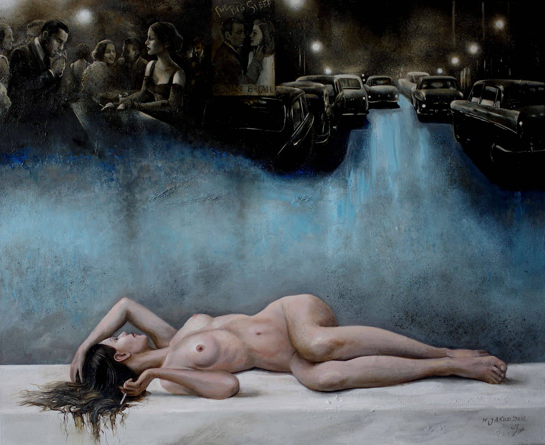 The painting exudes a mysterious aura, combining elements of nostalgia and modernity. The color palette focuses on cold shades of blue, silver and black, creating a cool mood, but also an intriguing contrast between the naked body of a woman in the foreground and the dark urban background. The figure of a woman lies on a white background, her body is painted with extraordinary precision, emphasizing the texture of the skin and the delicacy of the hair. Of course, in the background we see mysterious figures and old cars, which evoke the atmosphere of noir. The artistic technique is a mix of realism and impressionism, with subtle brushstrokes that add a dynamic accent. The painting brings to mind a journey through time, as if we had found ourselves in another era in an instant. It can evoke feelings of longing, contemplation, and even a certain melancholy. "Wow, it looks like she's in a magical dream!" a child might say. The artist's work here balances on the border between reality and dream, and I personally feel a slight shiver on my skin looking at these colliding worlds. The composition of the painting is truly engaging, and the mysterious details encourage a longer pause and reflection on the transience of time and beauty.