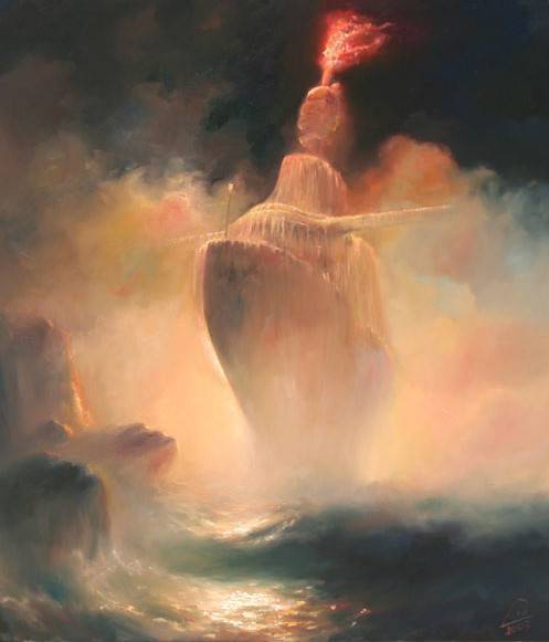 A mysterious aura dominates the painting, permeating the dense fog and creating a mystical atmosphere. Blazing orange and red light contrasts with the dark, almost black tones of the surroundings. A centrally placed, massive ship with a mast thrusting upward somewhat resembles a figure from another world, emanating strength and mystery. The artist employed the impasto technique, whose eye-catching texture adds depth and dynamism to the composition. The brushes left slightly chaotic marks that give the painting vitality and movement. Looking at this work, one can feel a hint of unease, perhaps even fascination—as if the ship floating among the clouds were shedding earthly constraints. Wow, it really looks like something out of a fairy tale! The painting fires the imagination, inviting you to spin your own tales. Isn’t it amazing how a canvas can paint stories? Stylistically, the artist flirts with Impressionism, yet elements of Symbolism are clearly present. The scene prompts reflection on the journey—both literal and spiritual—like dreams hovering above reality. Despite the simplicity of the brushwork, the emotions radiating from the painting will tug at the heart of every viewer. It’s a true “dreamscape” that can immerse your thoughts for a long time.