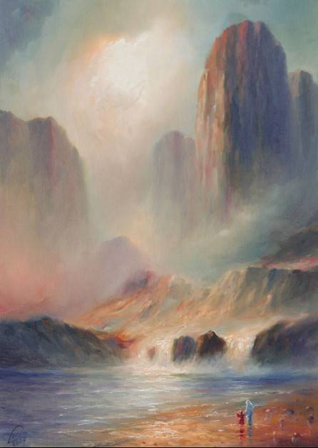 A mystical palette of colors dominates the painting. Soft hues of blue, pink, and gold form a dreamy composition where towering rocks meet the clouds. Mists drifting around the monumental peaks add a sense of mystery. The water below shimmers with sunlit reflections, while two tiny figures on the shore draw the eye, creating a contrast of scale. The atmosphere in the painting is like something out of a fairy tale, full of contemplation and calm. The artist uses oil paints to subtly blend colors and lend the work delicacy. One could say they paint like an Impressionist, though a hint of Surrealism is visible here. The painting emanates a quiet calm. On the one hand it is majestic; on the other, it exudes cozy warmth. Looking at it, you can feel time slowing, compelling us to reflect on nature and our place in it. To me, it is like a magical dream I don’t want to part with—like a fresh, warm hug for the mind. I find myself wondering how a child’s imagination might perceive this landscape. Perhaps it’s a place where dragons hide behind the clouds, and a golden fish that grants wishes lives in the water. For a seven-year-old, it’s simply a world of adventures. The painting ushers the viewer into another dimension, full of dreams and unspoken longings.