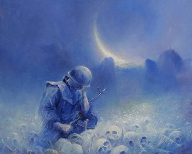 The image is immersed in a cool, bluish tone that dominates the entire composition. The figure of a soldier, pinned down by a knee and hunched, holding a weapon, seems to be sinking into a sea of pale skulls. The moon discreetly illuminates the landscape, casting gentle light on the scene and creating a mood full of melancholy and contemplation. The artist uses soft, blurred brushstrokes, which lends the painting a dreamlike quality and makes it look as if it came from a dream. The entire work emanates a sense of sadness and reflection, reminding us of the transience of life. Looking at it, one can feel the weight of loss, of war, as well as moments frozen in time. The painting makes you ponder the meaning of conflicts and what they leave behind. It’s as if someone pulled a page from the book of life and showed us what lies within. Despite the grim subject, there is something extraordinarily beautiful in it, full of deep truth. One might say it’s like an evening odyssey, where with every step you encounter more questions. Hey, it’s a little frightening, but also magical, and you can’t take your eyes off it. The image draws you in like a whirlpool, leaving the viewer with a mix of emotions.