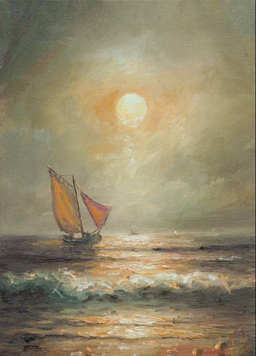 The painting depicts a charming seascape at sunset. Warm shades of yellow and orange dominate, blending with cool tones of sea green and blue. At the center is a solitary sailboat with yellow and pink sails, gently swaying on the shimmering water. The composition is harmonious, and the sky illuminated by the setting sun adds a magical mood to the whole scene. The painting conveys calm and a hard-to-describe sense of melancholy. The atmosphere emanating from this work is both nostalgic and soothing. The technique is probably impasto, with distinct, dynamic brushstrokes that add texture and depth. The artist has successfully captured a moment you can almost hear - the sound of the waves and the gentle whisper of the wind. The picturesque landscape seems to live and breathe. The painting moves the viewer’s heart, evoking memories of carefree holidays by the sea. The splashes of color are so realistic that we can feel the warmth of the sun on our skin. It stirs a longing for a moment of solitude and reflection. "Mom, I saw a sea like that!" a child, full of wonder, would write. Reflection on the fleeting nature of moments makes us pause for a moment. The painting not only pleases the eye, but also carries us into a time suspended in colors and shapes.