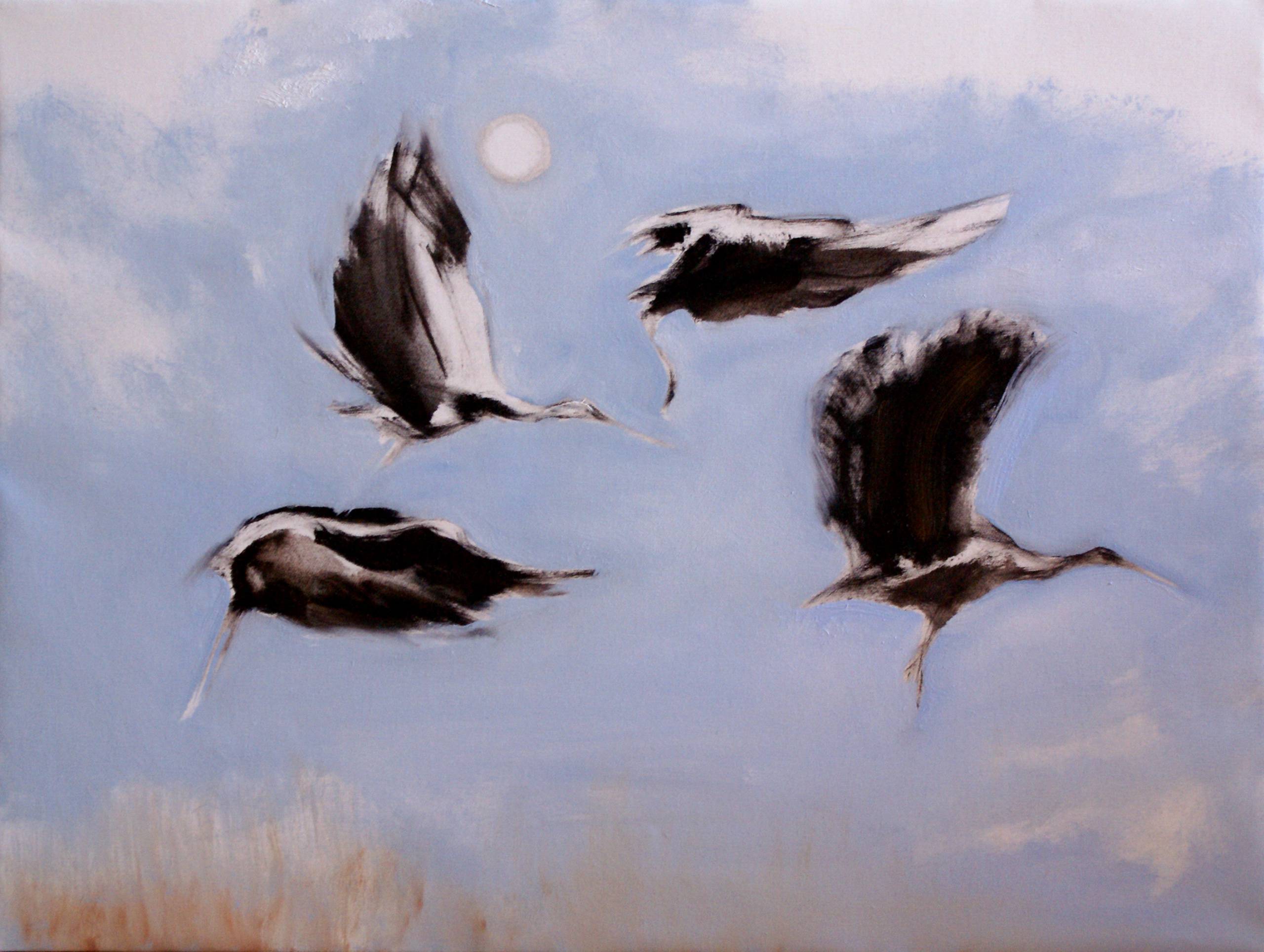 In the painting we see a group of four birds soaring majestically against the blue sky. Subtle shades of blue intertwine with delicate white clouds, creating a harmonious composition full of peace. The contrast of the almost black, abstractly rendered bodies of the birds enhances the work’s dynamism. The artist has opted for a blurring technique, which lends the scene an ephemeral quality. Such chaos in motion, yet also a kind of magical harmony. The atmosphere is full of freedom, like a summer day when there are no worries in the sky, and the sun (or perhaps the moon) smiles softly. The artist’s style is somewhat impressionistic, with elements of expressionism. Looking at this painting, you can feel as if you were flying yourself. Wow, such wonders of the sky! Each bird seems to have its own story, its own dream. The painting may inspire reflections on transience and the beauty of the moment, or simply a smile, because something in that freshness of the air is just "cool." It draws you into a land of dreams, where anything is possible. It always fascinates me how art can sweep you away and, for a moment, stop time. Something beautiful.