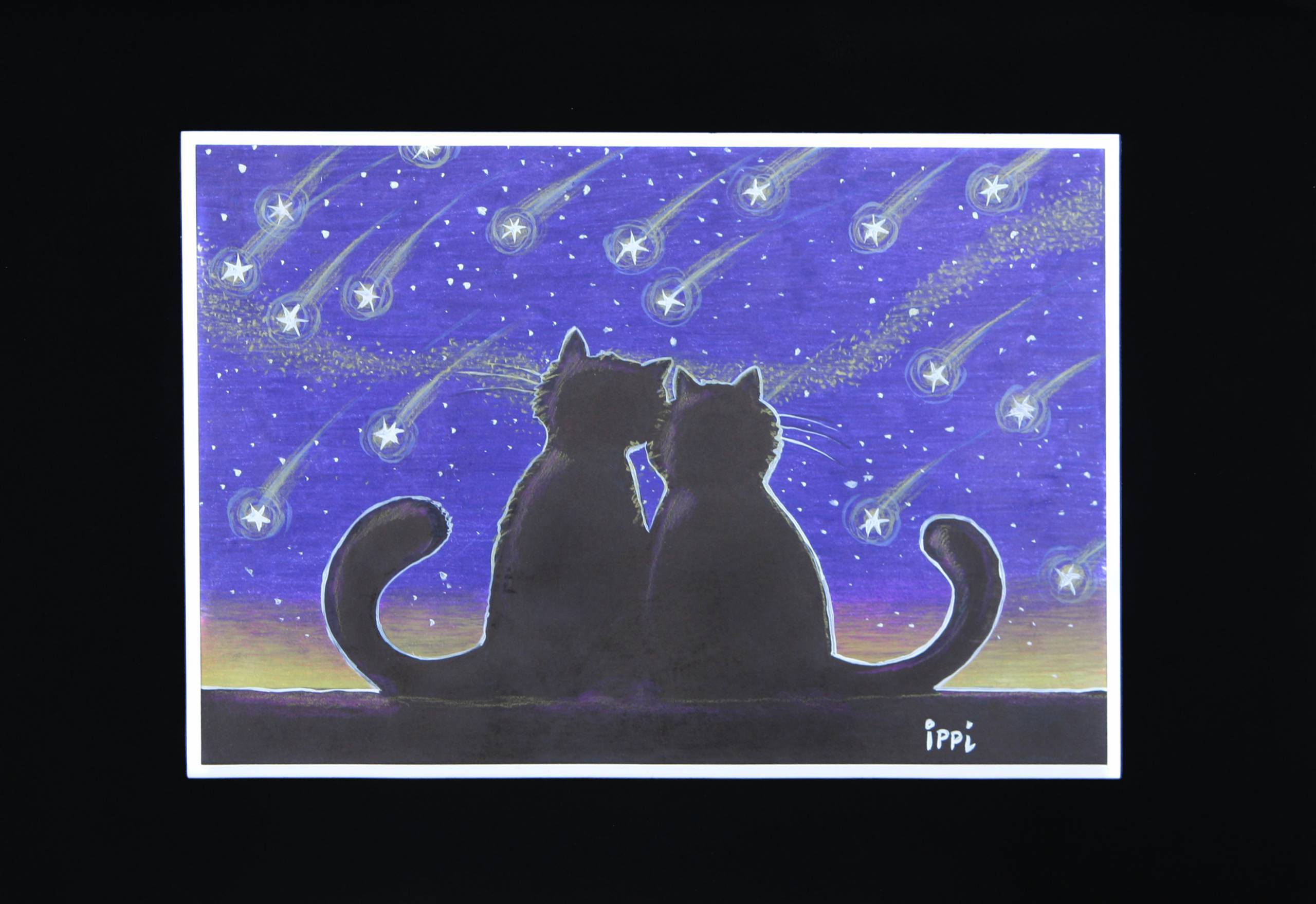 In the painting, two silhouettes of cats sit next to each other, staring at the starry sky. The shapes of the cats are black, contrasting with the colorful palette of the sky. The background is a delightful blue-purple, fading into a pastel sunset. The stars in the form of tiny white dots breathe life into the painting, while comets with long golden tails cross the sky. The illustration is like a scene from a fairy tale, full of magic. The artistic technique of this work seems to slightly refer to animation, with a distinct, cartoonish style. The atmosphere of the painting is definitely romantic and calm, like a warm summer evening. That these cats are sitting like that and not worrying about anything. Such idle staring at the sky can evoke in us a feeling of nostalgia, a desire to freeze the moment. There is some intimacy in this painting that cannot be missed. One would like to be there, between them, and feel this peace. Looking at it, I have the impression that time has stopped. Stars and magic uniting in a single moment.