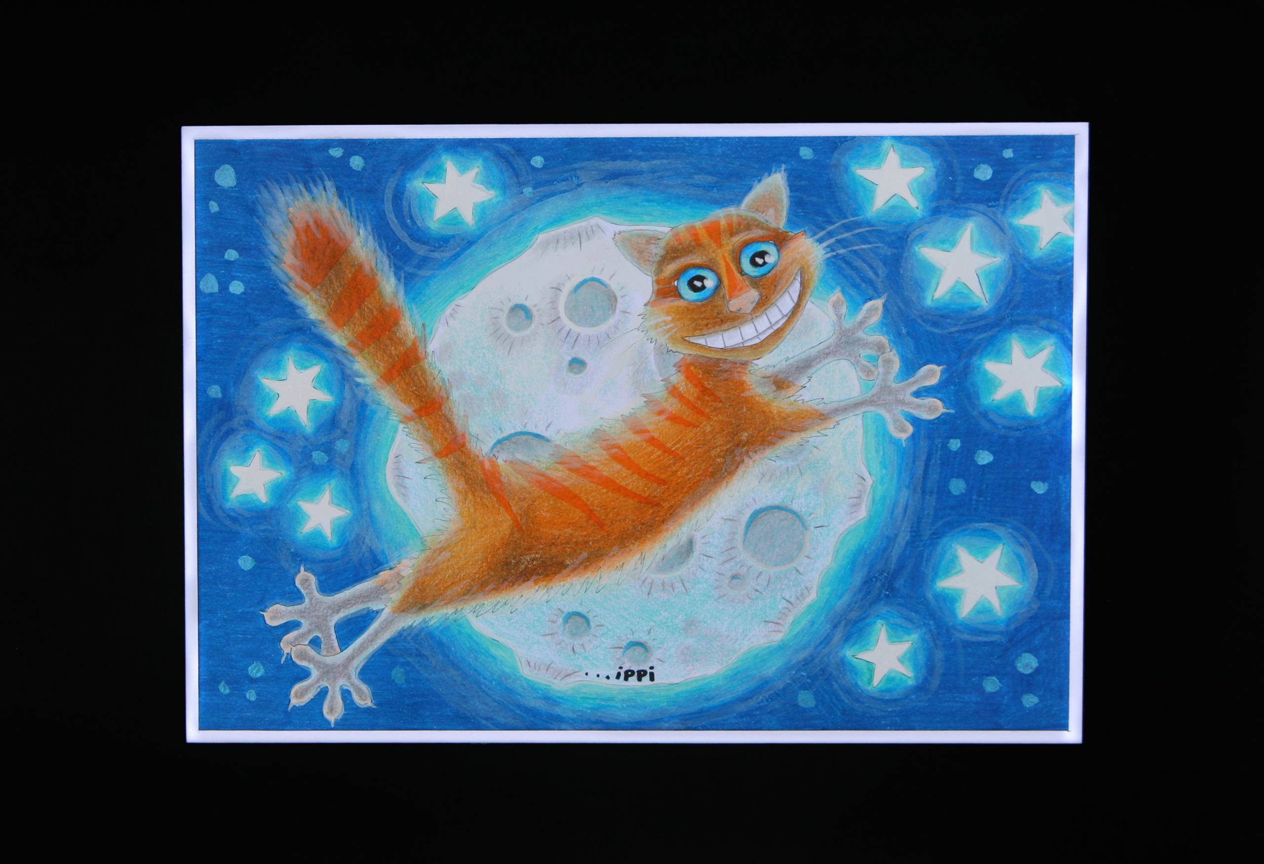 The painting features a cheerful ginger cat that seems to float above the surface of the moon. The background shimmers with various shades of blue, creating the impression of a night sky illuminated by twinkling stars. The cat with a wide smile has huge blue eyes that add to its expression of joyful carefreeness. The timeline seems to disappear here, creating a dreamlike atmosphere, as if we were transported to the world of a fairy tale or dreamy fantasies. The artistic style of the painting is light and cartoonish, which emphasizes the brightness of the colors and the dynamic lines. The presence of this smiling animal evokes a feeling of childhood play and excitement. As if saying, "Look, Mom, I'm flying!" The technique of mixing pastel colors with intense accents gives the impression of depth and movement. It is the kind of story that you can 'feel' on your own skin, like the touch of the wind on your face while running. The work can make you smile and remind you of moments full of joy and dreams, such as those from your childhood. It is a feeling of freedom and unbridled joy that can distract us from earthly worries for a moment.