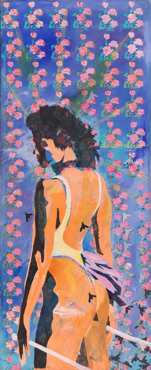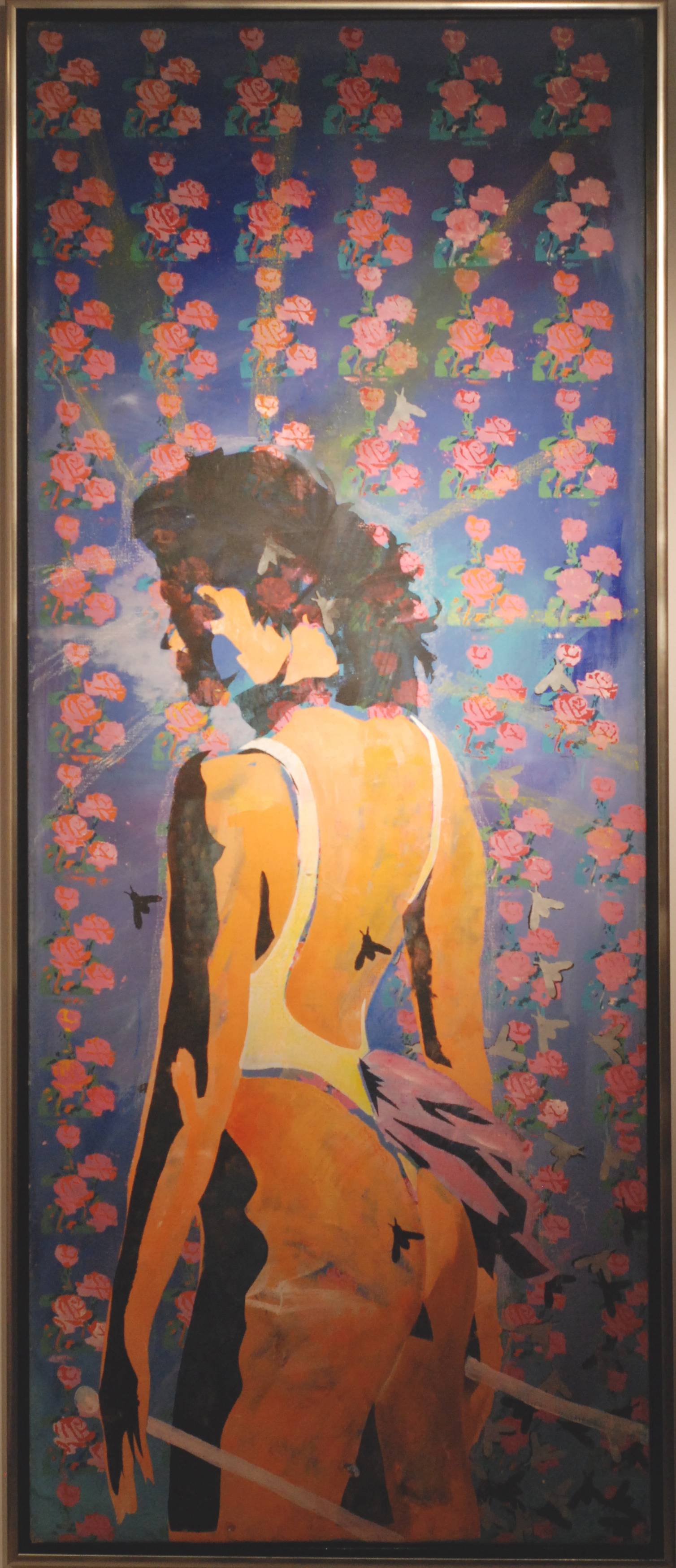 The image depicts the figure of a woman surrounded by floating roses against an intensely blue background. The colors are vibrant, dominated by pinks and purples that contrast with the figure’s orange-tinged skin. The composition is dynamic, almost pulsing with life, and the fractured contours add a sense of motion. The atmosphere is highly dreamlike, as if we were witnessing something on the border between wakefulness and sleep. The artist employs a technique that resembles a collage while simultaneously using acrylic paints. You can see that every element has been placed with precision. The viewer may feel a distinct “wow” when looking at this magical scene. Gazing at it, one can sense a breath of freedom and lightness, as if the rose petals were whispering “be free.” It’s a painting that compels reflection and leaves room for personal interpretations. It can evoke feelings of nostalgia, joy, and even a mysterious melancholy. As a child might say: it’s colorful and beautiful! It’s the kind of work that encourages you to pause, look deeper, and immerse yourself in a world of imagination. With each glance, you can discover something new—something that previously escaped notice.