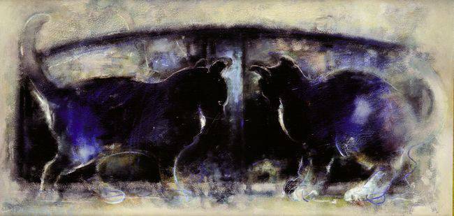 The painting depicts two black cats standing face to face against a mysterious, blurred landscape. Dark shades of purple and navy dominate, contrasting with delicate, luminous accents that spill around the animals’ silhouettes. The composition is dynamic yet harmonious, drawing the eye with its intriguing tension. The atmosphere of the painting is enigmatic, full of unfathomable secrets and unspoken nuances. The artistic style suggests the use of impressionist techniques, where soft brushstrokes blend with a subtle interplay of light and shadow. This can evoke in the viewer a sense of elusiveness and the passing of the moment. The painting also prompts reflection on relationships and interactions that are not always clear. Hey, these kitties are like a mirror image! This vision is both mysterious and charming, it arouses curiosity and does so with grace. Personally, I feel that the balance between light and darkness carries a certain melancholy. There is something magical in the way the artist captured this moment.