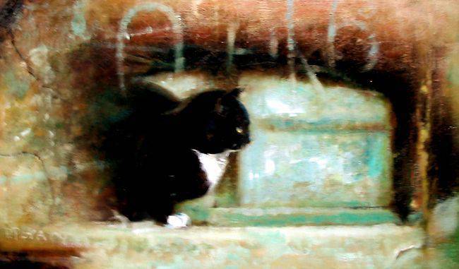 In the painting, we see a black cat sitting amid old, crumbling walls. Warm browns and a rusty patina dominate the background, creating a raw, almost industrial setting. The texture is rough, breaking the light in a way that recalls thick brushstrokes. The composition centers on the cat, who seems like a lost spirit in this abandoned place. Its eyes shine subtly, adding a note of mystery, as if it were gazing into infinity. The atmosphere of this work is melancholy and serene. The artist used the impasto technique, which adds depth and a distinctive “touch” to the painting. Feel the rawness! This technique makes the painting feel almost three-dimensional. The emotions this view evokes are mixed. One can feel sadness, but also a certain nostalgia for times gone by. It reminds us of the transience of the moment and the beauty found in forgotten places. The painting is like an old album full of memories. The cat here is a metaphor for loneliness, but also independence. Mom, I want a kitty like that! This work inspires reflection on solitude and the beauty in simplicity. Every element, from the colors to the technique, works in harmony, creating a box of emotions. There is something magical in this painting that lets you lose yourself in it for long moments.