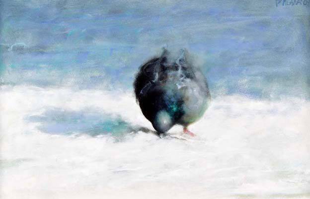The painting depicts a gray pigeon against the backdrop of a winter landscape. The bird is the central point of the composition, surrounded by the whiteness of snow and the gentle blue of the sky, which creates a harmonious, tranquil atmosphere. The colors are muted, as if filtered through the winter air. The pigeon looks as though it has bent down to pick something up, which lends it a sense of dynamism despite the seemingly static scene. The artist employed subtle brushstrokes reminiscent of Impressionism, imparting a delicate quality to the whole. The pigeon’s soft contours and the ethereal landscape make the painting seem almost dreamlike. The technique of blurring the edges introduces an element of mystery. Looking at it, one can feel the chill of a winter day and a quiet longing for spring. The work evokes a sense of solitude, but also peace. “Look, a bird!”—that’s what a child might exclaim while pointing at this painting. My heart beats faster at the sight of this simple yet beautiful scene. The painting is like a snapshot of a moment caught in time, where everything is “perfectly calm.”